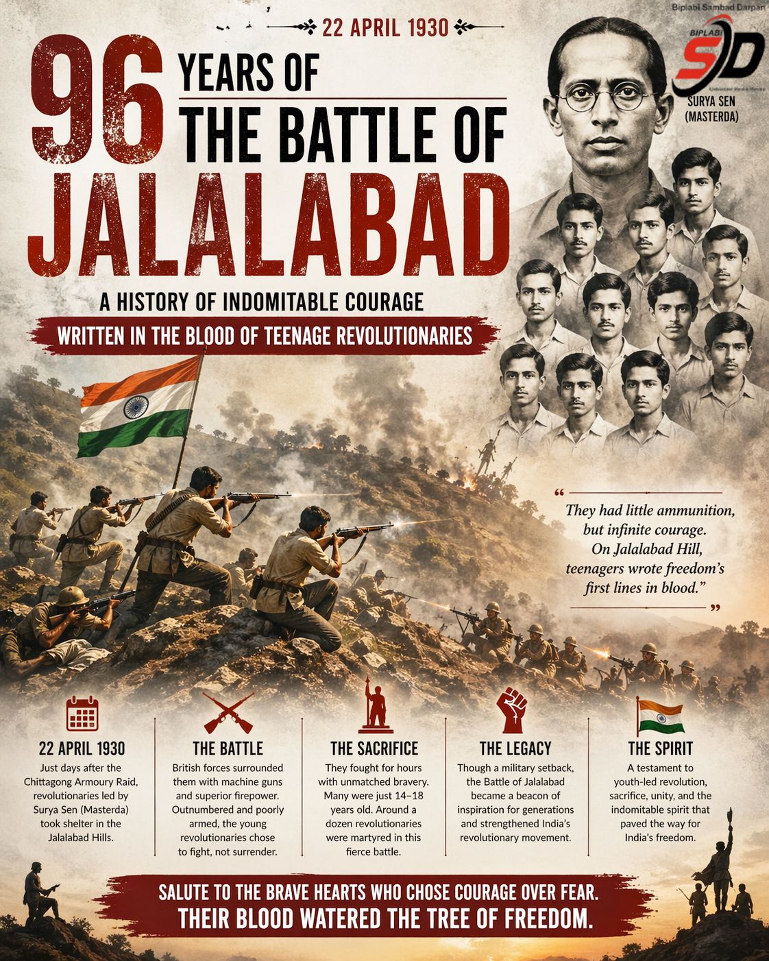 পরবর্তীতে তাঁদের অনেকেই ইন্ডিয়ান রিপাবলিকান আর্মির বিভিন্ন দায়িত্বে যুক্ত হন।১৯৩০ সালের ২২ এপ্রিল, Surya Sen-এর নেতৃত্বে মাত্র ৫৪ জন তরুণ বিপ্লবী—যাদের অনেকেই সদ্য কৈশোর পেরিয়েছে—চট্টগ্রামের Jalalabad Hill-এ ব্রিটিশ বাহিনীর এক শক্তিশালী রেজিমেন্টের বিরুদ্ধে সম্মুখসমরে অবতীর্ণ হন। সীমিত অস্ত্রশস্ত্র নিয়েই অসাধারণ সাহস ও কৌশলে তাঁরা লড়াই চালিয়ে গিয়ে ব্রিটিশ সৈন্যদের ব্যাপক ক্ষয়ক্ষতি ঘটাতে সক্ষম হন। যুদ্ধক্ষেত্রে গুলিবিদ্ধ সহযোদ্ধাকে বাঁচাতে ছুটে যাওয়া, শেষ মুহূর্তে বন্ধুকে বিদায় জানানো কিংবা মৃত্যুর মুখেও হাসিমুখে লড়াই চালিয়ে যাওয়া—এইসব দৃশ্য সেই সময়ের বিপ্লবী মানসিকতার প্রতিচ্ছবি হয়ে আছে। কেউ শেষ মুহূর্তে সহযোদ্ধাকে বলেছিল, “চললাম, পরে দেখা হবে”—যেন মৃত্যু নয়, এক অদ্ভুত আত্মবিশ্বাসই তাদের চালিত করেছিল।বিধু ভট্টাচার্য, নরেশ রায়, দেবপ্রসাদ গুপ্ত—এদের মতো বহু বিপ্লবী ছিলেন এই লড়াইয়ের অংশ। কেউ গুলিবিদ্ধ অবস্থাতেও হাস্যরস করছিলেন, কেউ আবার শেষ নিঃশ্বাস পর্যন্ত সহযোদ্ধাদের সাহস জুগিয়েছেন। তাঁদের মধ্যে মানবিকতা, বন্ধুত্ব আর দেশের প্রতি নিঃস্বার্থ ভালোবাসা এক অনন্য অধ্যায় তৈরি করেছিল।ব্রিটিশ বাহিনীর আধুনিক অস্ত্রশস্ত্র ও ভারী ফায়ারপাওয়ারের সামনে সীমিত অস্ত্র নিয়ে লড়াই করছিল এই বিপ্লবীরা। তবুও তাদের অদম্য মনোবল এবং কৌশলগত নেতৃত্বে শেষ পর্যন্ত ব্রিটিশ বাহিনী পিছু হটতে বাধ্য হয় বলে ইতিহাসে উল্লেখ রয়েছে।আজ ২২ এপ্রিল, সেই ঐতিহাসিক জালালাবাদ যুদ্ধের ৯৬তম বার্ষিকী। ভারতের সশস্ত্র স্বাধীনতা আন্দোলনের ইতিহাসে এই অধ্যায় আজও স্মরণ করিয়ে দেয়—স্বাধীনতার জন্য আত্মত্যাগ কখনও বৃথা যায় না।