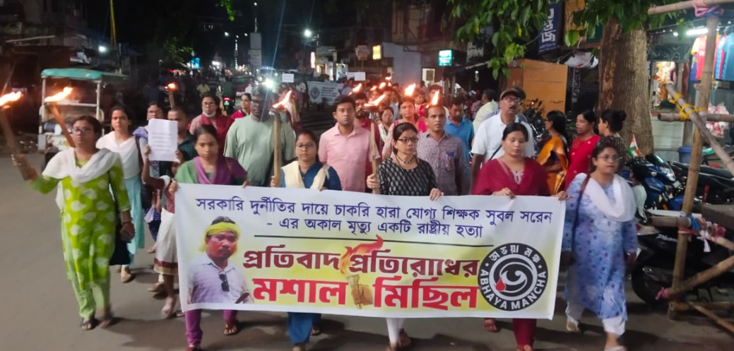 পুশিশ আটকদের উপর তীব্র মানসিক ও শারীরিক নির্যাতন করে বলে গ্রেফতার হওয়া শিক্ষক গণ সহ অন্যান্যরা অভিযোগ করেছেন। পাশাপাশি তাদের ছাপার অযোগ্য ভাষায় পুলিশ গালাগাল করে বলে অভিযোগ। সুবল বাবুর ঘটনার প্রতিবাদে,যোগ্য চাকুরি হারা শিক্ষক-শিক্ষিকা-শিক্ষাকর্মীদের ন্যায় বিচারের দাবিতে,যোগ্য চাকুরি প্রার্থীদের সাথে ন্যায় বিচারের দাবিতে, আন্দোলন রত শিক্ষকদের সাথে পুলিশের বর্বর আচরণের প্রতিবাদে, রাজ্যসরকার ও চাকরি চোরদের দোষীদের শাস্তি দাবিতে, তদন্তে সিবিআই সঠিক ভূমিকা পালনে ব্যার্থতাকে ধিক্কার জানিয়ে মেদিনীপুর শহরে প্রতিবাদী মশাল মিছিল ও পথ অবরোধ কর্মসূচি অনুষ্ঠিত হলো মেদিনীপুর"অভয়া মঞ্চ"র উদ্যোগে। মেদিনীপুর শহরের পঞ্চুর চক থেকে মিছিল শুরু হয়ে রিং রোড পরিক্রমা করে মিছিল পুনরায় পঞ্চুর চকে শেষ হয়। কেরানী তলায় মিনিট ৫ এর জন্য পথ অবরোধ করা হয়। সেখানে মোমবাতি জ্বালিয়ে সুবল বাবুকে শ্রদ্ধা জানানো হয় এবং এখানে পথ সভায় বক্তব্য রাখেন যোগ্য চাকুরি হারা শিক্ষক কৃষ্ণ গোপাল চক্রবর্তী। মিছিল শেষে পঞ্চুর চকে পথসভায় বক্তব্য রাখেন আদিবাসী অধিকার রক্ষা মঞ্চের জেলা সম্পাদক অধ্যাপক সুকুমার মুর্মু,যোগ্য চাকুরি হারা শিক্ষিকা সঙ্গীতা সাহা প্রমুখ। অভয়া মঞ্চের পক্ষে এদিনের মিছিলে নেতৃত্ব দেন অধ্যাপক প্রসেনজিৎ আচার্য, শিক্ষক সুদীপ কুমার খাঁড়া, শিক্ষিকা মধুমিতা ভূঞ্যা, শিক্ষক জগন্নাথ খান প্রমুখ। এদিনের মিছিলে অভয়া মঞ্চের পাশাপাশি। সন্তান ও পরিবার নিয়ে উপস্থিত ছিলেন যোগ্য চাকুরিহারা শিক্ষক অধিকার রক্ষা মঞ্চের প্রতিনিধিরা, ছিলেন নাগরিক সমাজের প্রতিনিধিরা, ছিলেন শিক্ষক সংগঠন এবিটিএ, এবিপিটিএ, অধ্যাপক সমিতি ও শিক্ষাকর্মী সমিতির প্রতিনিধিরা।