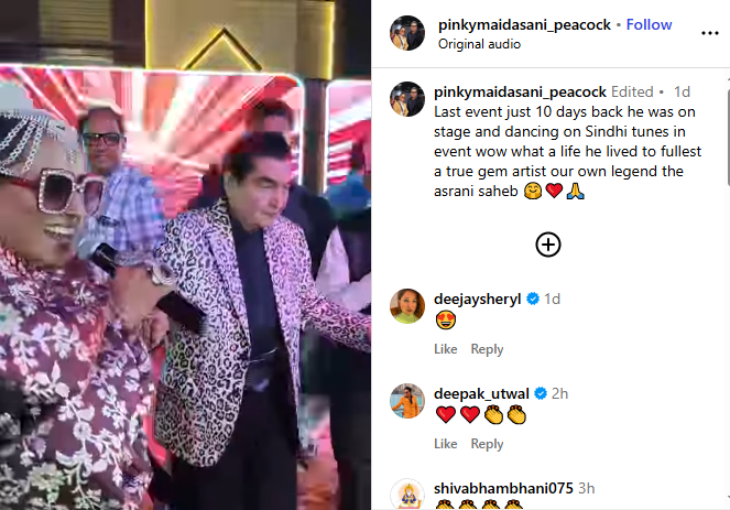 ভিডিওটি শেয়ার করে পিঙ্কি লেখেন, "মাত্র ১০ দিন আগে তাঁর শেষ ইভেন্ট ছিল। তিনি স্টেজে ছিলেন এবং সিন্ধি সুরের তালে নাচছিলেন। ওয়াও, কী দারুণ জীবনই না তিনি যাপন করলেন! একজন সত্যিকারের রত্নশিল্পী, আমাদের কিংবদন্তি আসরানি সাহেব।" চিকিৎসকরা জানিয়েছিলেন, তাঁর বুকে জল জমেছে। তবে শেষ রক্ষা হয়নি জনপ্রিয় এই অভিনেতার। ১৯৪১ সালের ১ জানুয়ারি রাজস্থানের জয়পুরে জন্মগ্রহণ করেছিলেন আসরানি । পড়াশোনা করেছিলেন সেন্ট জেভিয়ার্স স্কুল থেকে। আর হিন্দি সিনেমায় তাঁর কৌতুকাভিনয়ের অবদান অনস্বীকার্য। পাঁচ দশকের বেশি সময় ধরে ৩৫০টিরও বেশি ছবিতে অভিনয় করেছেন তিনি। তাঁর অভিনয় দর্শকের হৃদয়ে চিরস্থায়ী স্থান করে নিয়েছে।প্রসঙ্গত, সত্তরের দশকে অসরানি হয়ে ওঠেন বলিউডের অন্যতম জনপ্রিয় চরিত্র অভিনেতা। ‘মেরে আপনে’, ‘কোশিস’, ‘চুপকে চুপকে’, ‘ছোটি সি বাত’, ‘রফু চক্কর’, ‘অভিমান’, ‘বাবুর্চি’-এর মতো সিনেমায় তাঁর অভিনয় আজও স্মরণীয়। তবে তাঁর সবচেয়ে বিখ্যাত চরিত্র নিঃসন্দেহে রমেশ সিপ্পির কালজয়ী ছবি ‘শোলে’-তে সেই জেলারের ভূমিকায়। যা আজও ভারতীয় সিনেমার ইতিহাসে অনন্য উদাহরণ হয়ে আছে। অভিনয়ের পাশাপাশি তিনি সফলভাবে পরিচালনা করেছেন ‘চলা মুরারি হিরো বননে’ (১৯৭৭) এবং ‘সালাম মেমসাব’ (১৯৭৯)-এর মতো ছবি। গুজরাটি সিনেমাতেও তিনি নায়ক হিসেবে দারুণ সাফল্য পেয়েছিলেন। জনপ্রিয় ‘ধমাল’ সিরিজের মতো কমেডি ছবিতেও তাঁকে দেখা গিয়েছিল। যেখানে তাঁর অভিনয় দর্শকদের প্রশংসা কুড়িয়েছিল।