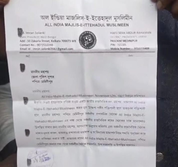 দলের প্রতিনিধিদের সেই বৈঠকে আমন্ত্রণ জানানোর জন্য প্রশাসনের কাছে আবেদন জানানো হয়। দলের নেতৃত্বের বক্তব্য, গণতান্ত্রিক প্রক্রিয়াকে আরও শক্তিশালী করতে এবং নির্বাচনী ব্যবস্থাপনার বিভিন্ন বিষয় নিয়ে মতামত তুলে ধরার জন্য সর্বদলীয় বৈঠকে AIMIM-এর উপস্থিতি অত্যন্ত জরুরি। প্রশাসনের সঙ্গে সমন্বয় রেখে শান্তিপূর্ণ ও সুষ্ঠু নির্বাচন নিশ্চিত করতে তারা সদর্থক ভূমিকা নিতে প্রস্তুত বলেও আবেদনপত্রে উল্লেখ করা হয়েছে।এই বিষয়ে জেলাশাসকের দপ্তর থেকে আবেদন গ্রহণ করা হয়েছে বলে জানা গেছে। এখন প্রশাসনের সিদ্ধান্তের দিকেই তাকিয়ে রয়েছে AIMIM-এর পশ্চিম মেদিনীপুর জেলা কমিটি।
