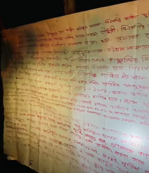 আপনাদের বিরুদ্ধে ইসলাম ও মুসলিম সম্প্রদায়ের বিরুদ্ধে কার্যকলাপে জড়িত থাকার অভিযোগ রয়েছে। অবিলম্বে আপনাদের কার্যকলাপ, সভা-সমাবেশ বন্ধ করার জন্য সতর্ক করা হচ্ছে। যদি আপনারা তা না করেন, তবে আপনাদের গুরুতর পরিণতির সম্মুখীন হতে হবে।'ব্যানারে আরও হুমকি দেওয়া হয়েছে যে, যদি হিন্দু সম্প্রদায়ের সদস্যরা এই নির্দেশ মেনে না চলে, তবে তাদের বাড়িঘর, সম্পত্তি এবং ব্যবসা প্রতিষ্ঠান রেহাই পাবে না এবং 'কেউ আপনাদের রক্ষা করতে পারবে না'। ব্যানারটিতে আরও বলা হয়েছে, 'এটিই শেষ সতর্কতা। যেকোনও প্রতিরোধের ফলে গুরুতর ব্যবস্থা নেওয়া হবে।'