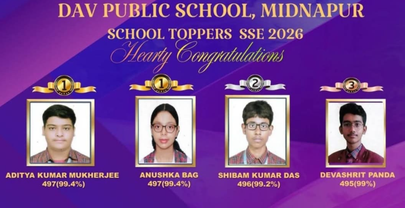 নিজস্ব সংবাদদাতা : মাধ্যমিক পরীক্ষায় অভূতপূর্ব সাফল্যের সাক্ষী থাকল মেদিনীপুরের ডিএভি পাবলিক স্কুল। ২০২৫-২৬ শিক্ষাবর্ষের সিবিএসই বোর্ড পরীক্ষায় গত বছরের সমস্ত রেকর্ড ভেঙে নতুন নজির গড়ল এই বিদ্যালয়ের ছাত্রছাত্রীরা।এবারের পরীক্ষায় ৯৯.৪% নম্বর পেয়ে যৌথভাবে প্রথম স্থান অধিকার করেছে আদিত্য মুখার্জি ও অনুষ্কা বাগ। তাঁদের এই ফলাফল অল ইন্ডিয়া স্তরেও সম্ভাব্য চতুর্থ স্থানের দাবি রাখছে। ৯৯.২% নম্বর পেয়ে দ্বিতীয় স্থানে রয়েছে শিবম দাস এবং ৯৯% নম্বর পেয়ে তৃতীয় স্থান দখল করেছে দেবশ্রীত পান্ডা।শুধু মেধাতালিকাতেই নয়, সামগ্রিক ফলাফলেও নজর কেড়েছে বিদ্যালয়।