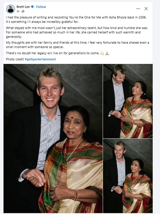 মানুষের মৃত্যু হয়। কিন্তু রূপকথার মৃত্যু হয় না। তা জীবনের সঙ্গে মিশে জীবনের গল্প হয়েই থেকে যায়। এই কঠিন সময়ে তিনি আশা ভোঁসলের পরিবার, পরিজন ও ঘনিষ্ঠ বন্ধুদের প্রতি গভীর সমবেদনা ও শুভকামনা জানিয়েছেন। ব্রেট লি আরও বলেন, এমন এক অসাধারণ ব্যক্তিত্বের সঙ্গে জীবনের অল্প কিছু সময়ও ভাগ করে নিতে পারা তাঁর কাছে পরম সৌভাগ্যের, যা তিনি সারাজীবন মনে রাখবেন।