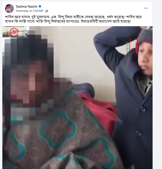 বাংলাদেশে হিন্দু নির্যাতন নিয়ে সোমবার ক্রমান্বয়ে কড়া সমালোচনা করলেন নির্বাসিত লেখিকা তসলিমা নাসরিন । তসলিমা নাসরিন, তার সোশ্যাল মিডিয়াতে বলেন শাহিন আর হাসান, দুই মুসলমান, এক হিন্দু বিধবা নারীকে হেনস্থা করেছে, ধর্ষণ করেছে। শাহিন আর হাসান কি শাস্তি পাবে? নাকি হিন্দু নির্যাতনের ব্যাপারেও ইনডেমনিটি অধ্যাদেশ জারি হয়েছে? ধর্ষণ ও নির্যাতনের ঘটনায় অভিযুক্ত শাহিন এবং হাসান সেই মহিলার ভিডিয়ো সোশ্যাল মিডিয়ায় পোস্ট করে। নির্যাতিতা দুই দুষ্কৃতীর বিরুদ্ধে কালীগঞ্জ থানায় অভিযোগ দায়ের করেন। অভিযোগপত্রে নির্যাতিতা দাবি করেন, প্রায় আড়াই বছর আগে কালীগঞ্জ পৌর এলাকার নদীপাড়া থেকে বিধবার কাছে থাকা দুইতলা বাড়ি ও জমি কিনেছিল শাহিন। এরপর থেকেই শাহিন নাকি কুপ্রস্তাব দিত সেই মহিলাকে। এদিকে শাহিনের কুপ্রস্তাবে রাজি না হওয়ায় বিভিন্ন ভাবে আগেও তাকে হেনস্থা করা হয়েছিল বলে অভিযোগ নির্যাতিতার।