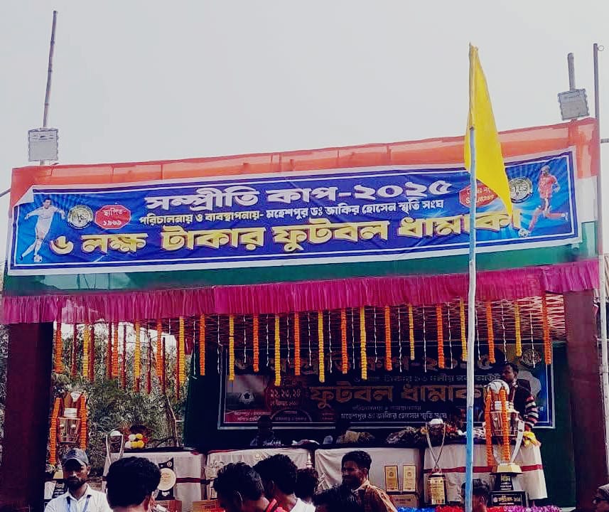 নিজস্ব সংবাদদাতা : বাঙালি ফুটবল প্রেমীদের জন্য এক চমৎকার আনন্দের উপলক্ষ হয়ে উঠলো পশ্চিম মেদিনীপুর জেলার চন্দ্রকোনা টাউনের মহেশপুর এলাকায় অনুষ্ঠিত হওয়া ‘সম্প্রীতি কাপ ২০২৫’ ফুটবল টুর্নামেন্টের উদ্বোধন অনুষ্ঠান। মহেশপুর হাই স্কুলের মাঠে ২২, ২৩, এবং ২৪ ডিসেম্বর তিন দিন ব্যাপী আয়োজিত এই ১৬ দলীয় নক আউট ফুটবল টুর্নামেন্টের উদ্বোধন করেছেন ইংলিশ চ্যানেল জয়ী প্রতিভাবান সাঁতারু আফরিন জাবি। ডা: জাকির হোসেন স্মৃতি সংঘের পরিচালনায় আয়োজিত এই ফুটবল টুর্নামেন্টে পশ্চিমবঙ্গের স্বনামধন্য ফুটবল দলগুলো অংশগ্রহণ করেছে। উদ্বোধনী অনুষ্ঠানে উপস্থিত ছিলেন BDO উৎকল পাইক মহাশয়, 2 নম্বর গ্রাম পঞ্চায়েতের প্রধান দোয়াল লোহার, উপপ্রধান মনজুর মোল্লা, মহেশপুর হাই স্কুলের প্রধান শিক্ষক সন্দীপ কুমার দেব বর্মন, তরুণ দোলই সহ এলাকার একাধিক বিশিষ্ট ব্যক্তি ও ক্রীড়াপ্রেমীরা।