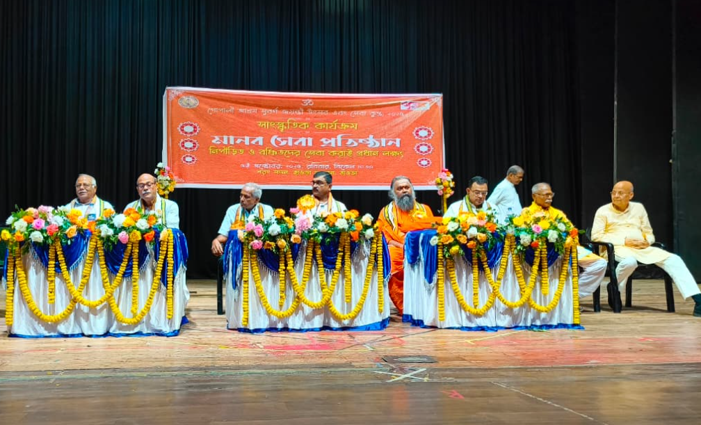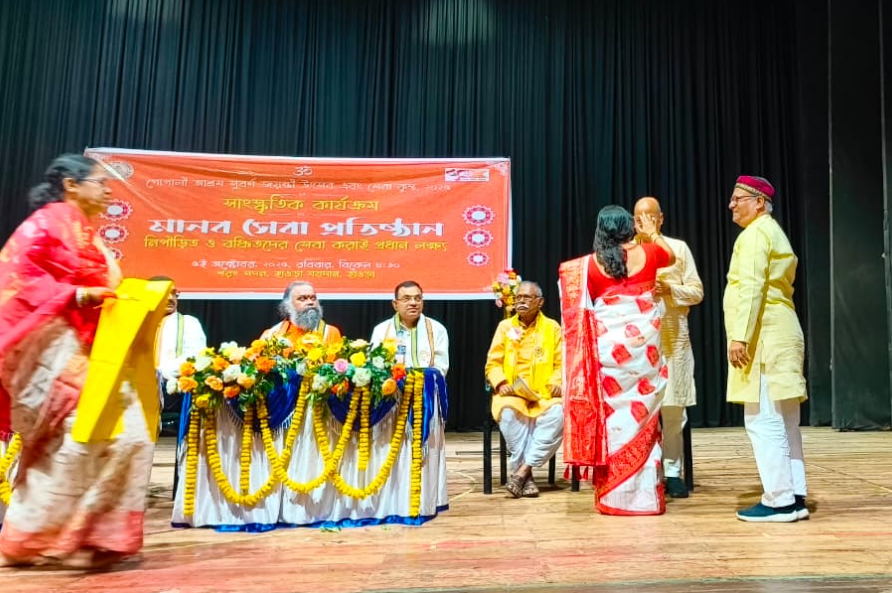 সমীরণ ভৌমিক : মানব সেবা প্রতিষ্ঠানের অন্যতম সেবা প্রকল্প পশ্চিম মেদিনীপুর জেলার খড়গপুর 'গোপালী আশ্রম'। এই গোপালী আশ্রমে সুবর্ণ জয়ন্তী বর্ষের সমাপন অনুষ্ঠান ও সেবা কুম্ভ ' ২০২৫ অনুষ্ঠিত হলো গত ৫ ই অক্টোবর '২০২৫, রবিবার, বিকাল ৪:৩০ টায়, হাওড়া ময়দানের, হাওড়া ' শরৎ সদন ' পেক্ষাগৃহে। এই গোপালী মানবসেবা প্রতিষ্ঠানের মূল লক্ষ্য নিপীড়িত ও বঞ্চিতদের সেবা করাই প্রধান লক্ষ্য। এই গোপালী সেবা প্রতিষ্ঠানে সেবা কর্মশালা এবং সাংস্কৃতিক কার্যক্রম এই আশ্রমের আরেকটি বৈশিষ্ট্য। উক্ত অনুষ্ঠানে প্রধান অতিথির আসন অলংকৃত করেন মনোজ কুমার সিংহ (IRTS) & GGM Of IRCTC, পূর্ব ভারত প্রধান, ভারত সরকার। বিশেষ অতিথি হিসাবে উপস্থিত ছিলেন আইআইটি খড়গপুর অধিকর্তা,অধ্যাপক তথা বিজ্ঞানী ড. সুমন চক্রবর্তী,রমাপদ পাল কলকাতা ক্ষেত্র প্রচারক, রাষ্ট্রীয় স্বয়ংসেবক সংঘ,নির্গুণানন্দজী মহারাজ, কেন্দ্রীয় মার্গ দর্শক মন্ডলীর সদস্য,বিশ্ব হিন্দু পরিষদ, গিরিধারী লাল কেষান,(সভাপতি, মানব সেবা প্রতিষ্ঠান) , দিলীপ কুমার ঝাওর, সম্পাদক, মানবসেবা প্রতিষ্ঠান, নন্দলাল লোহিয়া, মার্গদর্শক, মানব সেবা প্রতিষ্ঠান,নটবর লাল বঙ্গ, সম্পাদক,কেশব সেবা কেন্দ্র, হাওড়া,সুধাংশু শেখর পাত্র (প্রান্ত সেবা প্রমুখ) বিশ্ব হিন্দু পরিষদ ও বিশ্ব হিন্দু পরিষদের একনিষ্ঠ কর্মী,স্বপন মুখার্জি, বিশ্ব হিন্দু পরিষদ সেবার সর্বভারতীয় সহ সেবা প্রমুখ, বর্তমান কেন্দ্র প্রয়াগরাজ উত্তর প্রদেশ। উক্ত অনুষ্ঠানে উপস্থিত ছিলেন দেবাশীষ চট্টোপাধ্যায়,( রসায়ন বিভাগ) কল্যাণী বিশ্ববিদ্যালয়,প্রাক্তন অধ্যক্ষ বিশ্ব হিন্দু পরিষদ (দক্ষিণবঙ্গ)। এছাড়াও মঞ্চে আরো বিশিষ্ট গুণীজনদের উপস্থিতি ছিল। প্রথমে ভারত মাতা এবং দুর্গতিনাশিনী দুর্গা মায়ের চরণে পুষ্প দিয়ে শ্রদ্ধা জ্ঞাপন করেন মঞ্চে উপবিষ্ট গুণীজনেরা। তারপরে একে একে মঞ্চে উপবিষ্ট বিশিষ্ট গুণীজনদের ব্যাচ, চন্দনের ফোঁটা এবং উত্তরীয় পরিয়ে অনুষ্ঠান আরম্ভ হয়।