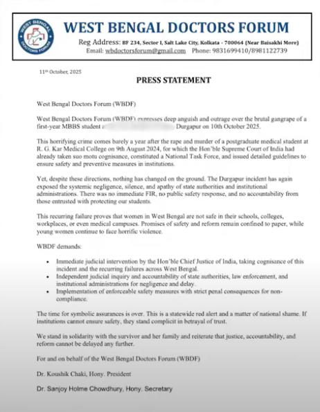 রিপোর্ট অনুযায়ী, নির্যাতিতা তরুণী ওড়িশার জলেশ্বরের বাসিন্দা। তরুণীর পরিবার জানিয়েছে, শুক্রবার রাত সাড়ে আটটা নাগাদ ওই পড়ুয়া সহপাঠীদের সঙ্গে কলেজের বাইরে বেরিয়েছিলেন ফুচকা খেতে। সেই সময় কয়েকজন যুবক ওই তরুণীর পথ আটকায় এবং জোর করে হাসপাতালের পিছনের দিকে থাকা একটি জঙ্গলে নিয়ে যায়। এদিকে দুষ্কৃতীদের তাড়া খেয়ে তরুণীর সঙ্গে থাকা বন্ধুটি পালিয়ে যান বলে জানা যায়। এদিকে গণধর্ষণ করার পর ডাক্তারি পড়ুয়ার মোবাইলটি ছিনিয়ে নেয় দুষ্কৃতীরা। এদিকে ঘটনা প্রসঙ্গে নির্যাতিতার বাবা বলেছেন, 'আমি এখানে আর ওকে পড়াব না। আমি ওকে বাড়ি নিয়ে চলে যাব।'এর আগে এই রাজ্যে আরজি করে ডাক্তারি পড়ুয়াকে ধর্ষণ করে খুন করা হয়েছিল। এদিকে কয়েক মাস আগেই কসবা ল কলেজে গণধর্ষণের ঘটনা ঘটেছিল। আর এবার দুর্গাপুরে বেসরাকরি হসপাতালের কাছে ধর্ষণের শিকার ডাক্তারি পড়ুয়া। এদিকে এই ঘটনার তদন্ত শুরু করলেও দুর্গাপুরের নিউটাউশিপ থানার পুলিশ এখনও কোনও অভিযুক্তকে ধরতে পারেনি। দুষ্কৃতীদের কোনও নামও জানা যায়নি।