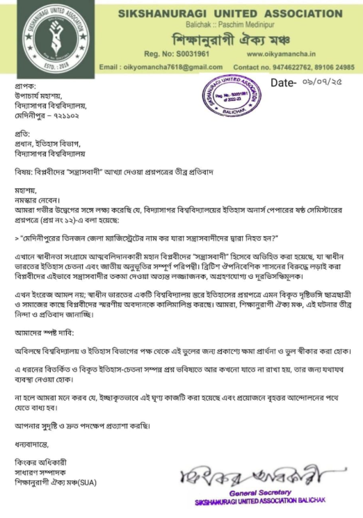 বুধবার বিদ্যাসাগর বিশ্ববিদ্যালয়ের অধীনস্থ সমস্ত কলেজগুলির ষষ্ঠ সেমেস্টারের ইতিহাস অনার্সের সি ১৪ পেপারের “মর্ডান ন্যাশনালিজম ইন ইন্ডিয়া” পরীক্ষা ছিল। ওই পেপারের ‘ক’ বিভাগের ১২ নম্বর দাগের প্রশ্ন ছিল,‘মেদিনীপুরের তিন জন জেলা ম্যাজিস্ট্রেটের নাম করো যারা সন্ত্রাসবাদীদের দ্বারা নিহত হন? মেদিনীপুরের বিপ্লবীদের সন্ত্রাসবাদী আক্ষ্যা বিদ্যাসাগর বিশ্ববিদ্যালয়ের। নিন্দা ও প্রতিবাদের ঝড় জেলা জুড়ে। বৃহস্পতিবার ১০ জুলাই বিদ্যাসাগর বিশ্ববিদ্যালয়ের উপাচার্য এই বিষয়টি নিয়ে প্রেস কনফারেন্স করেন।বিশ্ববিদ্যালয়ের ইতিহাসের বোর্ড অফ স্টাডিজের যিনি কনভেনার তাকে পদ থেকে সরিয়ে দেওয়া হয়েছে। সাংবাদিক সম্মেলনে বিশ্ববিদ্যালয়ের উপাচার্য ক্ষমা চেয়েছেন এই বিষয়টি নিয়ে।