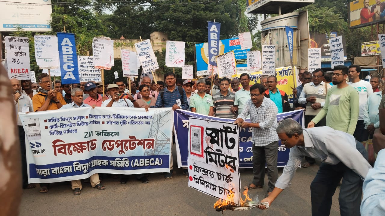 পশ্চিম মেদিনীপুর, নিজস্ব সংবাদদাতা : বর্ধিত বিদ্যুৎ মাসুল ফিক্সড চার্জ ও মিনিমান চার্জ প্রত্যাহার, স্মার্টলি টাকা লুটের যন্ত্র স্মার্ট প্রিপেইড মিটার বাতিল সহ গ্রাহক সমস্যা সমাধানের দাবিতে ZM-এর নিকট বিক্ষোভ ডেপুটেশন হয় ABECA এর আহ্বানে। পূর্ব ও পশ্চিম মেদিনীপুর, ঝাড়গ্রাম, বাঁকুড়া, পুরুলিয়া জেলার জোনাল ম্যানেজার এর কাছে এই ডেপুটেশন দিতে পাঁচ জেলার সহস্রাধিক গ্রাহকরা মেদিনীপুর স্টেশন থেকে মিছিল শহর পরিক্রমা করে। জেলাশাসক দপ্তরের সামনে পৌঁছালে গ্রাহকরা বিক্ষোভে ফেটে পড়েন। ক্ষুদিরাম মোড়ে হয় প্রতিকী পথ অবরোধ। পোড়ানো হয় স্মার্ট মিটার, ফিক্সড চার্জ ও মিনিমাম চার্জ এর প্রতিলিপি। অগ্নিসংযোগ করেন ABECA এর রাজ্য সাধারণ সম্পাদক শ্রী সুব্রত বিশ্বাস। সেখান থেকে মিছিল ফকির কুয়াঁস্থিত জোনাল ম্যানেজারের দপ্তরের অভিমুখে রওনা হয়। জোনাল ম্যানেজারের গেট বিশাল পুলিশ বাহিনী দিয়ে অবরুদ্ধ করে রাখা ছিল। গ্রাহকরা গেটে প্রবল বিক্ষোভ দেখান। গেটে ঠেলাঠেলি শুরু হয়ে যায়। জোনাল ম্যানেজারের দপ্তরের সম্মুখস্থ রাস্তা এক ঘন্টারও বেশি সময় অবরুদ্ধ হয়ে থাকে। চলে বিক্ষোভ সভা। ABECA এর রাজ্য সম্পাদকমণ্ডলের সদস্য তথা পশ্চিম মেদিনীপুর জেলা সভাপতি মধুসূদন মান্নার নেতৃত্বে পূর্ব মেদিনীপুরের সভাপতি অধ্যাপক জয়মোহন পাল, সম্পাদক শংকর মালাকার, পুরুলিয়ার সম্পাদক গৌতম হাতি, বাঁকুড়া জেলা সম্পাদক স্বপন নাগ এক প্রতিনিধি দল ZM এর কাছে ডেপুটেশন দেন। আগে থেকে ইন্টিমেশন দেওয়া সত্ত্বেও গ্রাহকদের সদুত্তর দিতে না পারার ভয়ে ZM পালিয়ে বেড়িয়েছেন বলতে শোনা যায় আন্দোলনকারীদের মুখ থেকে। চলতে থাকে অবরোধ। অন্তিমে অন্যান্য অফিসাররা স্মারকলিপি গ্রহণ করে পদক্ষেপ গ্রহণের কথা বলেন। নেতৃবৃন্দ দৃঢ়তার সঙ্গে হুঁশিয়ারি দিয়ে জানান স্মার্ট মিটার বসাতে গেলে তীব্র প্রতিরোধ হবে। ক্ষুদ্র শিল্পের বিপুল মিনিমাম চার্জ অনাদায়ে লাইন কাটা বন্ধ রাখতে হবে, গৃহস্থ সহ সকল বিদ্যুৎগ্রাহকের লোড বাড়ানোর অজুহাতে খামখেয়ালী বিল পাঠানোর প্রক্রিয়া বন্ধ করতে হবে। বাঁশের খুঁটি অবিলম্বে পরিবর্তন করতে হবে। অন্যথায় কাস্টমার কেয়ার সেন্টার থেকে শুরু করে সর্বস্তরে তীব্র গ্রাহক প্রতিরোধ আন্দোলন হবে। বিক্ষোভ সভায় বক্তব্য রাখেন শ্রী সুব্রত বিশ্বাস। তিনি গ্রাহকদের আহ্বান জানান- "স্মার্ট মিটার বসাতে গেলে তীব্র প্রতিরোধ করে ফেরত পাঠান, এই ডাকাতির যন্ত্র বসাতে দেবেন না।" তিনি আহ্বান জানান এর জন্য ট্রান্সফরমার ভিত্তিক প্রতিরোধ কমিটি গড়ে তুলুন। বেআইনি অযৌক্তিক বিপুল মিনিমাম চার্জ- অনাদায়ে লাইন কাটতে গেলে প্রতিরোধ করে ফেরত পাঠান। তিনি ঘোষণা করেন অতিরিক্ত লোডের নামে সর্বস্তরের গ্রাহকদের টাকা 