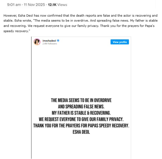 উল্টে ধর্মেন্দ্র কন্যা এষা দেওল ইনস্টাগ্রাম স্টোরিতে লিখলেন ধর্মেন্দ্রর শারীরিক অবস্থা এখন স্থিতিশীল।গতকাল রাতেই সোশাল মিডিয়ায় ধর্মেন্দ্রর শারীরিক অবস্থার কথা জানিয়ে হেমা মালিনী লিখেছিলেন, ” ধর্মেন্দ্র জির স্বাস্থ্য নিয়ে সবাই দুশ্চিন্তায়। তাই সবাইকে জানাতে চাই। চিকিৎসকদের কড়া নজরে রয়েছেন তিনি। তাঁর দ্রুত আরোগ্য কামনা করি।” এমনকী, সানি দেওলের টিমের তরফ থেকেও জানানো হয়েছে, ধর্মেন্দ্রর শারীরিক অবস্থা এখন স্থিতিশীল। অভিনেত্রী আরও বলেন, এমন ভিত্তিহীন খবর শুধু পরিবারের সদস্যদেরই নয়, অসংখ্য অনুরাগীদের মনেও ভয় ও বিভ্রান্তি তৈরি করছে। তিনি সকলকে অনুরোধ করেছেন, যাচাই না করে কোনও খবর যেন কেউ শেয়ার না করেন।