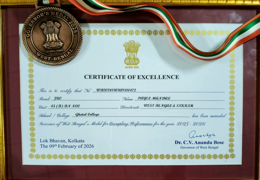 অভিজিৎ সাহা : এনসিসি-তে অসাধারণ কৃতিত্বের স্বীকৃতি হিসেবে কলকাতার রাজভবনে রাজ্যপাল ডক্টর সি ভি আনন্দ বোসের হাত থেকে সম্মানজনক ‘গভর্নর মেডাল’ ও মানপত্র পেলেন ঘাটাল রবীন্দ্রশতবার্ষিকী মহাবিদ্যালয়ের তৃতীয় বর্ষের ছাত্রী পায়েল মণ্ডল। তাঁর এই সাফল্যে চন্দ্রকোণা-১ ব্লকের বেলাদণ্ড গ্রাম সহ গোটা এলাকায় খুশির আবহ তৈরি হয়েছে।
