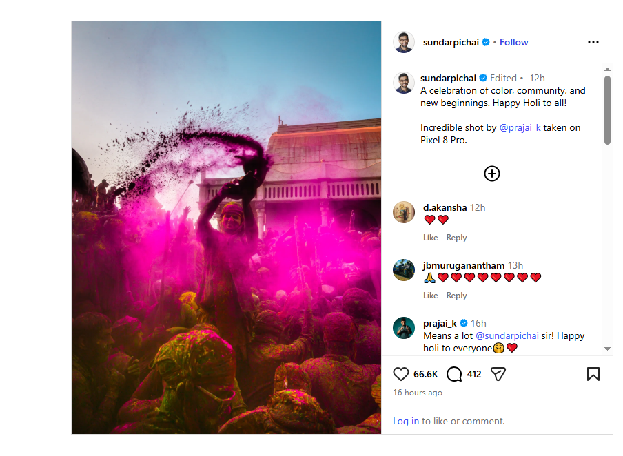 ক্যাপশনে পিচাই লেখেন, “রঙ, সম্প্রদায় এবং নতুন সূচনার উদযাপন। সকলকে হোলির শুভেচ্ছা! পিক্সেল ৮ প্রো-তে তোলা @prajai_k-র অসাধারণ ছবি।” উত্তরে ফটোগ্রাফার কাটকোরিয়া মজার ছলে মন্তব্য করেন, “অনেক অর্থবহ, সুন্দর পিচাই স্যার! সবাইকে হোলির শুভেচ্ছা।”পোস্টটি দ্রুতই ভাইরাল হয়ে যায়। বহু ব্যবহারকারী পিচাইকে তাঁর ভারতীয় শিকড়ের প্রতি অনুগত থাকার জন্য প্রশংসা করেন। গত বছরও তিনি পিক্সেল ব্যবহারকারীদের তোলা হোলির ছবি শেয়ার করেছিলেন।হোলি, যা রঙওয়ালি হোলি বা ধুলান্ডি নামেও পরিচিত, হিন্দু ক্যালেন্ডারের ফাল্গুন মাসে উদযাপিত হয়। এ বছর ৪ মার্চ, ২০২৬ (বুধবার) দেশজুড়ে পালিত হচ্ছে এই উৎসব।