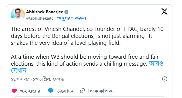 নিজস্ব সংবাদদাতা : কয়লা কেলেঙ্কারি মামলার তদন্তে বড় পদক্ষেপ করল এনফোর্সমেন্ট ডিরেক্টরেট (ইডি)। I-PAC-এর অন্যতম পরিচালক ও সহ-প্রতিষ্ঠাতা ভিনেশ চান্ডেলকে দিল্লি থেকে গ্রেফতার করেছে কেন্দ্রীয় তদন্তকারী সংস্থা। ১৩ই এপ্রিল সোমবার গভীর রাতে তাঁকে আটক করা হয় বলে সূত্রের খবর। ‘বেআইনি আর্থিক লেনদেন প্রতিরোধ আইন’ (PMLA)-এর আওতায় এই গ্রেফতারি হয়েছে বলে জানা গিয়েছে। ১৪ই এপ্রিল মঙ্গলবার সকালে ইডি জানায়, দিল্লির একটি বিশেষ আদালত ভিনেশ চান্ডেলকে ১০ দিনের ইডি হেফাজতের নির্দেশ দিয়েছে। কয়লা পাচার ও বেআইনি আর্থিক লেনদেনের সঙ্গে তাঁর যোগ রয়েছে কি না, তা খতিয়ে দেখতেই এই হেফাজত অত্যন্ত গুরুত্বপূর্ণ বলে মনে করছে তদন্তকারী মহল।এই গ্রেফতারিকে ঘিরে সরগরম রাজ্য রাজনীতি। তৃণমূল কংগ্রেসের সর্বভারতীয় সাধারণ সম্পাদক Abhishek Banerjee কড়া প্রতিক্রিয়া জানিয়ে বিজেপিকে সরাসরি আক্রমণ করেছেন। নিজের X (প্রাক্তন টুইটার) হ্যান্ডেলে দীর্ঘ পোস্টে তিনি লেখেন, “ভয় দেখিয়ে মুখ বন্ধ করা যাবে না।” তাঁর অভিযোগ, ভোটের আগে বিরোধী শিবিরকে চাপে ফেলতেই এই ধরনের পদক্ষেপ নেওয়া হচ্ছে।