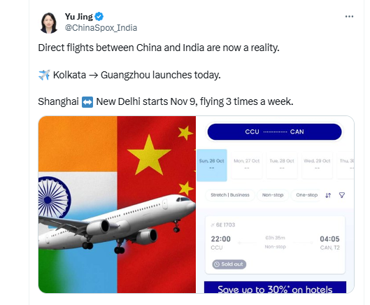 তিনি লেখেন, “চীন ও ভারতের মধ্যে সরাসরি ফ্লাইট এখন বাস্তবতা।সরাসরি বিমান সংযোগ পুনরায় শুরু হওয়ার ফলে দুই দেশের মধ্যে বাণিজ্য, পর্যটন ও সাংস্কৃতিক বিনিময়-এর এক নতুন অধ্যায় সূচিত হচ্ছে। বিশেষজ্ঞদের মতে, এই উড়ান পরিষেবা কেবল ভ্রমণকে সহজ করবে না, বরং দুই দেশের ব্যবসায়িক ও বিনিয়োগ সম্পর্ক পুনর্গঠনে সহায়তা করবে। একজন বাণিজ্য বিশ্লেষকের ভাষায়, “এই রুট পুনরায় চালু হওয়া শুধু আকাশপথের সংযোগ নয়, এটি দুই এশীয় পরাশক্তির মধ্যে আস্থা পুনর্গঠনের প্রতীক।”পাঁচ বছর পর ভারত ও চীনের মধ্যে আকাশপথ আবার খুলে গেল— যা ভবিষ্যতের সহযোগিতা, যোগাযোগ এবং আঞ্চলিক স্থিতিশীলতার দিকে এক গুরুত্বপূর্ণ পদক্ষেপ হিসেবে বিবেচিত হচ্ছে।
