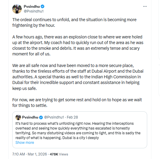 PV Sindhu জানিয়েছেন, “আমরা সবাই এখন নিরাপদে আছি এবং আরও নিরাপদ স্থানে স্থানান্তরিত হয়েছি। দুবাই বিমানবন্দর কর্মী এবং কর্তৃপক্ষের অক্লান্ত প্রচেষ্টার জন্য এটি সম্ভব হয়েছে। আমাদের নিরাপত্তা নিশ্চিত করতে তাদের অব্যাহত সহায়তার জন্য দুবাইয়ে অবস্থিত ভারতীয় হাই কমিশনকেও বিশেষ ধন্যবাদ। আপাতত, পরিস্থিতি স্বাভাবিক হওয়ার অপেক্ষায় আমরা কিছুটা শিথিল হওয়ার এবং আশাবাদী থাকার চেষ্টা করছি।”
