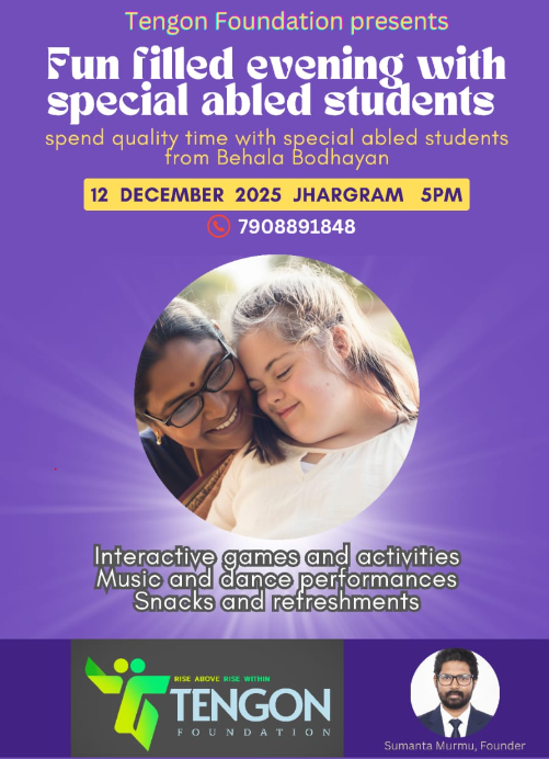 নিজস্ব সংবাদদাতা : সমাজকে অনুপ্রেরণা জোগাতে এবং বিশেষ সক্ষম সম্পন্নদের প্রতি ভালোবাসা ও যত্নের বার্তা পৌঁছে দিতে ঝাড়গ্রাম শহরে "তেগোন ফাউন্ডেশন" (Tengon Foundation) আয়োজন করেছিল এক 'আনন্দময় সন্ধ্যা'।অনুষ্ঠানটির মূল আকর্ষণ ছিল কলকাতার বেহালা বোধায়ন স্কুলের বিশেষ সক্ষম ছাত্র-ছাত্রীরা, যারা মূলত অটিজম স্পেকট্রাম ডিসঅর্ডার(ASD)-এ আক্রান্ত। তাদের সঙ্গে আনন্দময় সময় কাটাতে ঝাড়গ্রাম শহরের মানুষজন ও তেগোন ফাউন্ডেশনের সদস্যরা উপস্থিত ছিলেন।সার্বিক এই সন্ধ্যাটি ছিল আনন্দ, হাসি এবং ভালোবাসায় পরিপূর্ণ।