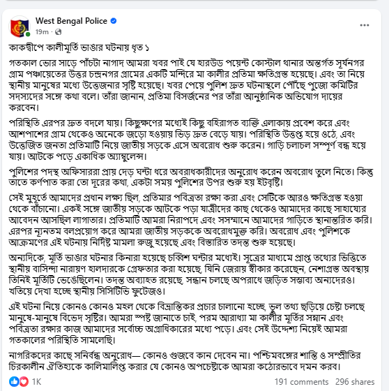 যে মন্দিরে বছরের পর বছর গ্রামের মানুষ পূজা দিয়েছে, আশ্রয় পেয়েছে, সেই মন্দির আজ অপবিত্র হয়েছে দুর্বৃত্তদের হাতে। এই ঘটনায় পুলিশ ইতিমধ্যেই এক ব্যক্তিকে (নারায়ণ হালদার) গ্রেপ্তার করেছে। ওই ব্যক্তি (নারায়ণ হালদার) কাকদ্বীপেরই বাসিন্দা। গোপন সূত্রে খবর পেয়ে ওই ব্যক্তির বাড়িতে হানা দেয় পুলিশ। বৃহস্পতিবার তাকে কাকদ্বীপ মহকুমা আদালতে তোলা হয়েছে ।
