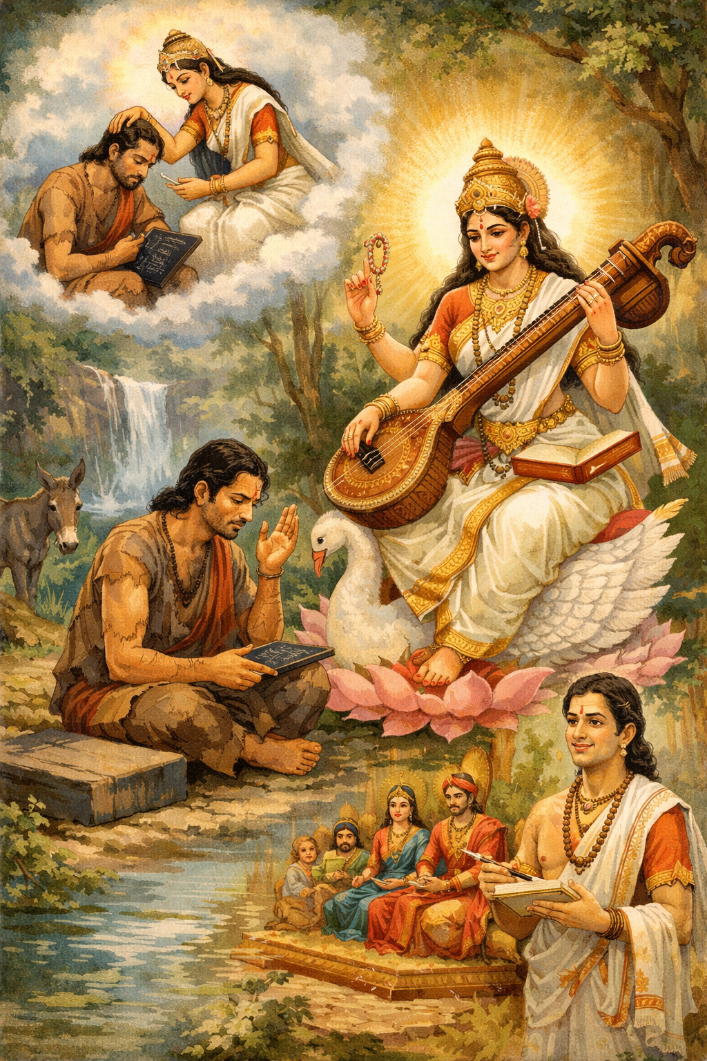 এমনিতেই বোকামির জন্য কালিদাস প্রতিদিন স্ত্রীর কাছে বকা-ঝকা শুনতেন। ডাল কাটার বোকামি যেন তা আরও উস্কে দিল। স্ত্রীর এমন ব্যবহারে কালিদাস একদিন রাগে, ক্ষোভে, দুঃখে, অপমানে ঘর থেকে বের হয়ে আত্মহত্যা করার জন্য নদীতে ঝাপ দিলেন। কিন্তু তিনি সেখানেও ব্যার্থ। নদী থেকে তাকে উদ্ধার করলেন দেবী কালি, আর সেই কৃতজ্ঞতায় তিনি হয়ে গেলেন দেবীর ‘কালি’র দাস। সে অনুসারেই তার নাম হয়ে গেল কালিদাস। শুধু যে দেবী কালি তার জীবন বাঁচালেন তা-ই নয়, তাকে দিলেন জ্ঞান ও বুদ্ধির আশীর্বাদ, তাতেই কালিদাস হয়ে উঠলেন মহাকবি। রামায়ণ রচয়িতা বাল্মীকির দস্যু থেকে সাধক হয়ে ওঠার গল্পের মতো কালিদাস মূর্খ থেকে হয়ে উঠলেন মহাকবি। তার বুদ্ধির তারিফ করতে গিয়ে তার নামে আজও প্রচলিত আছে হাজার হাজার জটিল ধাঁধাঁ। তিনি হয়ে উঠলেন প্রাচীন ভারতের সর্বশ্রেষ্ঠ কবি ও নাট্যকার। কালিদাস দুটি মহাকাব্য লিখেছেন- ‘রঘুবংশম্’ এবং ‘কুমারসম্ভবম্’। নাটক রচনা করেছেন তিনটি- ‘বিক্রমোর্বশীয়ম্’, ‘মালবিকাগ্নিমিত্রম্’ আর ‘অভিজ্ঞানশকু্ন্তলম্’। গীতিকাব্য লিখেছেন দুটি- একটি হলো ‘মেঘদূতম্’, যাকে আমরা বাংলায় ‘মেঘদূত’ বলে জানি এবং অন্যটির নাম ‘ঋতুসংহারমা’।