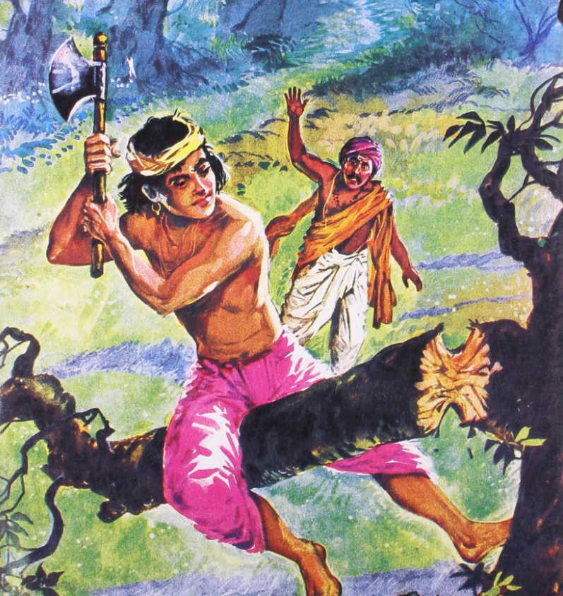 রাজপুত্রের মতো চেহারা থাকলেও বাস্তবে কালিদাস ছিলেন লেখাপড়া না জানা এক মূর্খ যুবক। নিজের ভাল-মন্দ বিচার করার মতো ক্ষমতাও ছিল না তার। একদিন কিছু লাকড়ির দরকার হলে কালিদাস গাছে উঠে গাছের যে ডালে বসে আছেন সেই ডালটিই কাটতে শুরু করলেন। উক্ত গাছের নিচ দিয়ে যাওয়ার সময় এক পথিক কালিদাসের এমন বোকামি দেখে তাকে ডাল কাটার সঠিক উপায় বলে দিলেন, কিন্তু কালিদাস এতটাই মূর্খ ছিলেন যে, ঐ পথিকের পরামর্শও তিনি অনুধাবন করতে ব্যর্থ হন। ডাল কাটতে গিয়ে ডালের সাথে কালিদাস নিজেও মাটিতে পড়ে আহত হন। বোকামির এমন সংবাদ সারা এলাকায় ছড়িয়ে পড়ে।