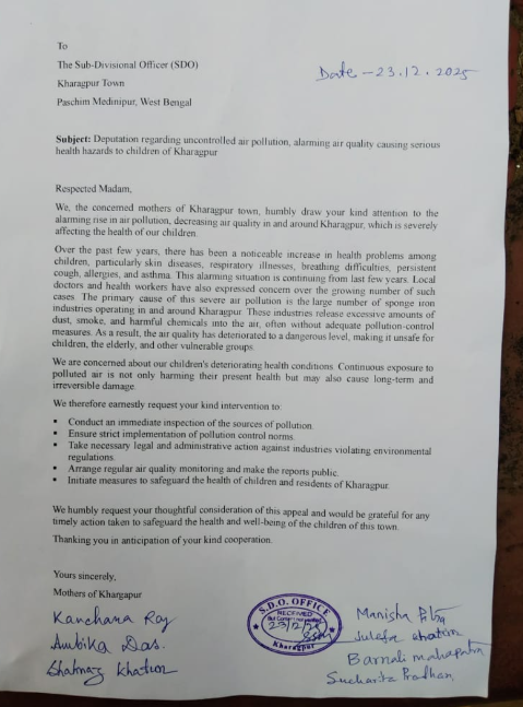আজ মহিলা প্রতিনিধিরা মহকুমা শাসককে দূষণের প্রভাব বোঝাতে কালো ডাষ্ট, বাচ্চাদের ডাক্তারদের নাম ফোন নম্বর, বাচ্চাদের পায়ের কালো ছবি, গাছের পাতাল বর্তমান অবস্থা, এবং খড়গপুরের বিগত কিছু দিনের AQI তথ্য দিয়ে আসা হয়েছে। আগামীদিনে আবার