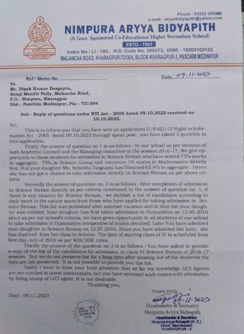 কিন্তু পশ্চিম মেদিনীপুরের জেলা শাসক যে আরটিআই রিপোর্ট জমা দিতে নির্দেশ দিয়েছেন (MEMO No 988/1/RTI/2024)তার রিপোর্ট কিন্তু নেই । আর একটা বিষয় লক্ষ্য করা যায়, পশ্চিম মেদিনীপুরের শিক্ষা দফতরের DI MEMO letter sign করেছেন ০৬ই মে ২০২৫ আর চিঠি পোস্ট হয়েছে তার ১৫ দিন পরে ২১শে মে ২০২৫ । উলটে ডিআই প্রধান শিক্ষকের অবসর নেওয়ার দিন যাবতীয় নিয়ম নীতিকে উড়িয়ে দিয়ে অবসরের দিনই চন্ডীচরণবাবুকে যাবতীয় অবসরকালীন সুযোগ সুবিধে পাইয়ে দেন বলে অভিযোগ।