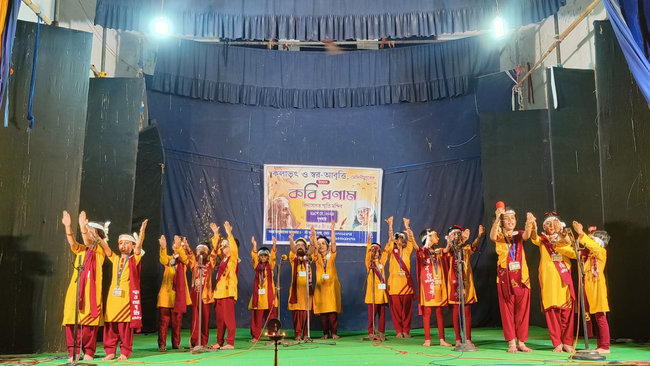 নিজস্ব সংবাদদাতা : মেদিনীপুর শহরের বিদ্যাসাগর হলে স্বর - আবৃত্তি, মেদিনীপুর ও কলাভৃৎ এর আয়োজনে কবি প্রণাম অনুষ্ঠান অনুষ্ঠিত হলো। দুই সংস্থার দুই শতাধিক ছাত্র-ছাত্রী এতে অংশগ্রহণ করেছে। রবীন্দ্র নজরুল নৃত্য,একক ও দ্বৈত কবিতার সমাহারে সেজে উঠেছিল অনুষ্ঠান। প্রদীপ প্রজ্জ্বলন করে অনুষ্ঠানের শুভারম্ভ করেন বিদ্যাসাগর বিশ্ববিদ্যালয়ের দুই অধ্যাপক তারকনাথ সাহু, নিবেদিতা ভট্টাচার্য ও সহকারী বিদ্যালয় পরিদর্শক সৌমেন ঘোষ মহাশয়। আবৃত্তির কোলাজ "ছোটদের নজরুল" "রবি ঠাকুরের মা "ও "অন্য রবীন্দ্রনাথ "সকলে নজর কাড়ে। ক্ষুদে শিল্পীদের নানা অনুষ্ঠান সকলের মন ছুঁয়ে যায়। প্রসঙ্গত কিছুদিন আগে স্বর আবৃত্তির উদ্যোগে কবি প্রণামের উদ্দেশ্যে বৃক্ষরোপণ করে সংস্থার সকল ছাত্র-ছাত্রীরা। প্রায় একশোর কাছাকাছি গাছ লাগায় ছাত্রছাত্রীরা। স্বর -আবৃত্তির কর্ণধার শুভদীপ বসু জানান "আমাদের ছাত্রছাত্রীরা কবি প্রণাম এর উদ্দেশ্যে প্রত্যেকেই একটি গাছকে বড় করার সংকল্প নিয়েছে ।কেউ থাকে ব্যাঙ্গালোরে, কেউ পশ্চিমবঙ্গের বিভিন্ন জেলায়। ৫ থেকে ৭৫ এর সদস্য সদস্যরা গাছ লাগিয়ে পরিবেশকে শুভ্র রাখার সংকল্প নিয়েছে।"অনুষ্ঠানে বৃক্ষরোপণ ও আবৃত্তির ওপর নানা পুরস্কার তুলে দেওয়া হয় ছাত্রছাত্রীদের হাতে। পুরস্কার তুলে দেন রাষ্ট্রপতি পুরস্কারপ্রাপ্ত শিক্ষক নির্মলেন্দু দে মহাশয়, নাট্যকর্মী দীপক বসু। কলাভৃৎ এর কর্ণধার অজয় সাহু বলেন," দুই সংস্থার উদ্যোগে একটি মনোরম সাংস্কৃতিক সন্ধ্যা উপহার দিতে পেরে আমরা খুশি। "অনুষ্ঠানে পলি পাহাড়ি ,শিলা মহাপাত্র শিবানী পাল, সুপর্ণা ব্যানার্জি, সুপর্ণা কোলের গীতাঞ্জলির নির্বাচিত কবিতা অন্য স্বাদ এনে দেয়। অনুষ্ঠানে সবাইকে ধন্যবাদ জ্ঞাপন করেন দীপা বসু ও মনীষা বসু।
