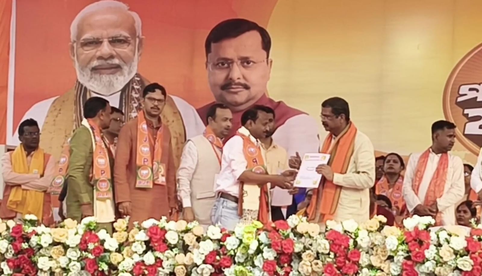 সেখ ওয়ারেশ আলী: গড়বেতায় বিজেপির পরিবর্তন যাত্রার সভায় এক গুরুত্বপূর্ণ রাজনৈতিক চমক সামনে এল। পশ্চিমবঙ্গ কুড়মি সমাজের রাজ্য সভাপতি হিসেবে দায়িত্ব সামলাচ্ছেন দীর্ঘদিন ধরে, তিনি হাজির হলেন বিজেপির পরিবর্তন যাত্রার সভামঞ্চে। আর সেখানেই আনুষ্ঠানিকভাবে ভারতীয় জনতা পার্টিতে যোগদান করেন তিনি। কেন্দ্রীয় মন্ত্রী ধর্মেন্দ্র প্রধান এবং বিরোধী দলনেতা শুভেন্দু অধিকারী-র উপস্থিতিতে বিজেপির পতাকা হাতে তুলে নিয়ে দলে নাম লেখান পশ্চিমবঙ্গ কুড়মি সমাজের পরিচিত মুখ রাজেশ মাহাতো। যোগদানের পর তিনি কেন্দ্রীয় শিক্ষামন্ত্রীর হাতে একটি ফাইলও তুলে দেন, যেখানে কুড়মি সমাজের একাধিক দাবি-দাওয়া উল্লেখ রয়েছে বলে জানা গেছে।