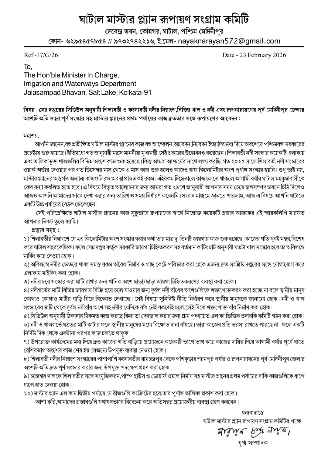 - শিলাবতীর পাশাপাশি কংসাবতীর রামচন্দ্রপুর থেকে পাঁশকুড়ার শ্যামপুর পর্যন্ত এবং রূপনারায়ণের পূর্ব মেদিনীপুর অংশে দ্রুত ড্রেজিং ও পূর্ণ সংস্কার।