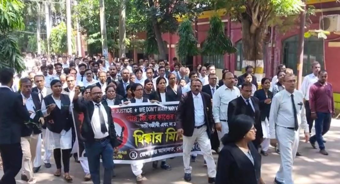 পশ্চিম মেদিনীপুর সেখ ওয়ারেশ আলী : জেলা জজ আদালতে এবার আর জি কর কাণ্ডের প্রতিবাদে আইনজীবী ও লো-ক্লার্কদের ধিক্কার মিছিল।জেলা জজ আদালতের আইনজীবী ও ল-ক্লার্করা একজোট হয়ে We want justice, We don't want any violence এই স্লোগানকে সামনে রেখে শনিবার দুপুরে জেলা জজ আদালত চত্বরে ধিক্কার মিছিল করল আইনজীবী এবং ল - ক্লার্করা। মূলত আর জি কর মেডিক্যালের চিকিৎসক ছাত্রী ধর্ষন ও খুনে জড়িতদের দৃষ্টান্ত মুলক শাস্তির দাবিতে এদিন দুপুরে পশ্চিম মেদিনীপুর জেলা আদালত চত্বর জুড়ে ধিক্কার মিছিলে সামিল হয় আদালতের সমস্ত আইনজীবী থেকে ল ক্লার্করা।'We want Justice" স্লোগান তুলে কলকাতায় আর জি কর মেডিক্যাল কলেজে মহিলা চিকিৎসককে খুন-ধর্ষণের মতো নৃশংস ঘটনার প্রতিবাদে এই ধিক্কার মিছিল করে।