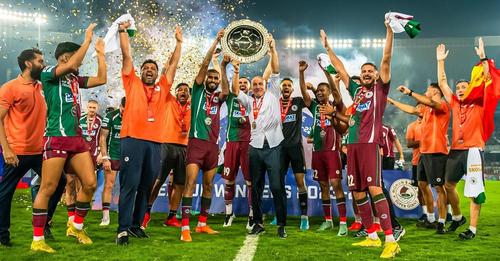 নিজস্ব সংবাদদাতা : মোহনবাগানের মুকুটে আরও একটি পালক জুড়ল । আইএসএলের(ISL) দশ বছরের ইতিহাসে প্রথমবারের জন্য লিগ-শিল্ড জিতে ইতিহাস গড়ল তারা । যুবভারতী ক্রীড়াঙ্গনে সোমবারের ম্যাচে মুম্বই সিটি এফসি-কে ২-১ গোলে হারিয়ে এই কৃতিত্ব স্পর্শ করে তারা। গতবছর জিতেছিল আইএসএল ট্রফি । কিন্তু এর আগে কখনও লিগ-শিল্ড জেতেনি হাবাসের দল। ২২ ম্যাচে ৪৮ পয়েন্ট নিয়ে লিগ-শিল্ড শেষ করল তারা। এদিনের ম্যাচে মোহনবাগানের হয়ে গোল করে লিস্টন কোলাসো এবং জেসন কামিংস। এখনও রয়েছে আইএসএলের ট্রফি পেয়ে ‘ডাবল’ করার সুযোগ।উল্লেখ্য, লিগ-শিল্ড জেতার ফলে মোহনবাগান পরের মরসুমে এএফসি চ্যাম্পিয়ন্স লিগ ২-এর গ্রুপ পর্বে সরাসরি খেলার সুযোগ পেয়ে গেল । এদিন প্রিয় দলকে সমর্থন করতে মাঠ ভরিয়েছিলেন হাজার পঞ্চাশেক সমর্থক।এদিনের ম্যচের শুরু থেকেই জেতার জন্য মোহনবাগানের মরিয়া ভাব স্পষ্ট চোখে পড়ছিল। ম্যাচের আগাগোড়াই আধিপত্য বজায় রাখে তারা। এদিন ডাগআউটে হাবাসের উপস্থিতি দলের মনোবলকে আরও বাড়িয়ে দেয়। অসুস্থ শরীরেও এই স্পানিশ কোচ সাইডলাইন থেকে ক্রমাগত উদ্বুদ্ধ করে গেছেন তাঁর দলকে। ম্যাচের শেষ দিকে দু’দলের খেলোয়াড়দেরই উত্তেজিত হয়ে পড়তে দেখা যায়।হ্যামিল লাল কার্ড দেখায় একসময় দশ জনের দল হয়ে যায় মোহনবাগান। কামিংস এবং লাচেনপাকেও হলুদ কার্ড দেখানো হয় পরের দিকে। ম্যাচের ৮৯ মিনিটে মোহনবাগানের সামান্য একটি ভুলে একটি গোল করেন মুম্বই সিটি এফসির ছাংতে। যদিও ম্যাচে আর ফেরা হয় না মুম্বই-এর। লিগ-শিল্ড জিতেই মোহনবাগান এদিন ঘরের মাঠে নতুন ইতিহাসের জন্ম দিল।