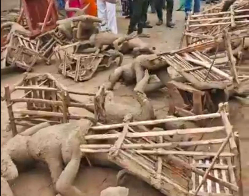 সেখানকার ৭০-৮০ টি মূর্তি ভেঙে দেওয়ার অভিযোগ অমিত দে নামে স্থানীয় এক যুবকের বিরুদ্ধে। সিসি ক্যামেরার ফুটেজ অনুযায়ী তাঁর ভাই অসিত দে-কেও কিছুক্ষণের জন্য দেখা যায়।পলাশবাবু জানান, কালী প্রতিমা, সরস্বতী প্রতিমা নিয়ে প্রায় ৭০-৮০টি মূর্তির ক্ষতি করেছেন অভিযুক্ত দুই যুবক। মূল কারখানা ঘরের ঝাঁপও ভাঙা হয়েছে। কিন্তু সময়ের অভাবে হয়তো সম্পূর্ণ প্রস্তুত প্রতিমা এবং তাঁর নিজের বাড়ির পুজোর প্রতিমার ক্ষতি করতে পারেননি দুষ্কৃতী।