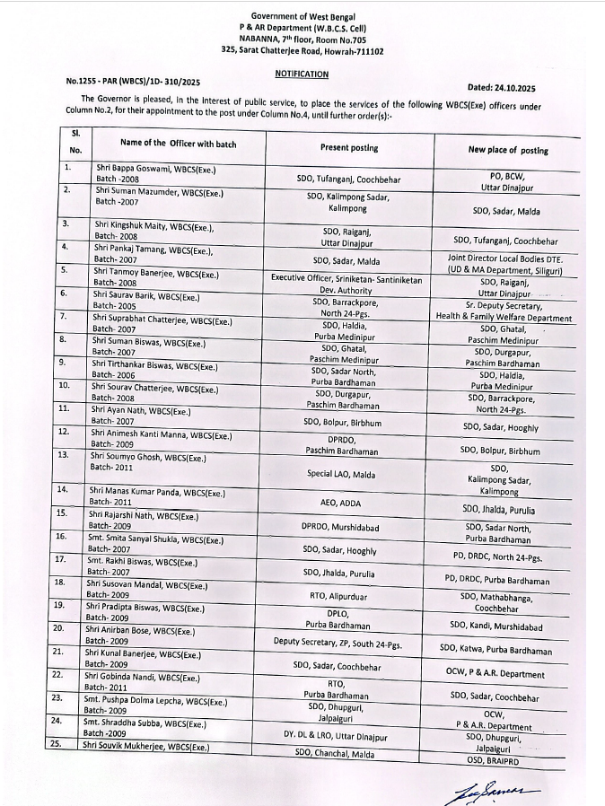 বরুণ কুমার বিশ্বাস : ২৭ শে অক্টোবর, নির্বাচন কমিশনের এস.আই.আর. ঘোষণার হওয়ার ঠিক পূর্বেই নবান্নের নির্দেশে বদলি হয়ে গেলেন ১০ জেলার ডি.এম .সহ মোট ৬৪ জন প্রশাসনিক আধিকারিক। এদের মধ্যে রয়েছেন ঘাটাল মহকুমার অত্যন্ত জনপ্রিয় এস.ডি.ও. সুমন বিশ্বাসও। তিনি বদলি হয়ে চলে যাচ্ছেন দুর্গাপুরের এস.ডি.ও. হয়ে। ঘাটালের বহুমুখী শিক্ষা, সংস্কৃতি এবং অন্যান্য সরকারি প্রকল্পের বিশেষভাবে উদ্যোগী এস.ডি.ও. সুমন বিশ্বাস ঘাটালের প্রত্যেকটি জনগণের মনে একটা শ্রদ্ধার আসন অর্জন করেছিলেন। যুব সম্প্রদায় থেকে বয়স্ক প্রত্যেক মানুষজনের কাছে তিনি হয়ে উঠেছিলেন অত্যন্ত জনপ্রিয়, যেটা সাধারণতঃ রাজনৈতিক প্রতিনিধিরাও অতটা এগিয়ে যেতে পারেন না।