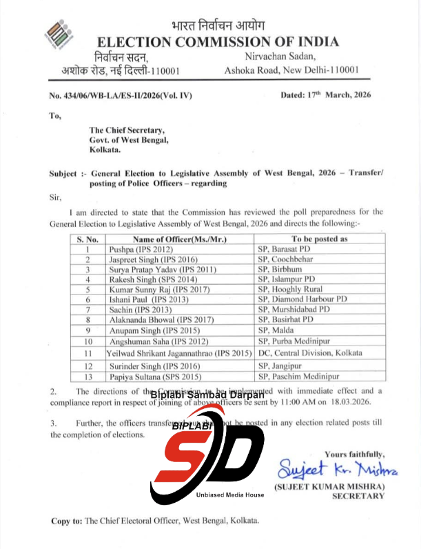 নতুন নিয়োগে দক্ষিণবঙ্গের এডিজি ও আইজিপি হিসেবে দায়িত্ব দেওয়া হয়েছে ডঃ রাজেশ কুমার সিংকে। অন্যদিকে, আইপিএস অফিসার পাপিয়া সুলতানার কর্মজীবনেও এসেছে উল্লেখযোগ্য মোড়। ২০২৪ সালের ফেব্রুয়ারিতে তিনি সন্দেশখালিতে দায়িত্বে ছিলেন। পরে তাঁকে ব্যারাকপুর পুলিশ কমিশনারেটের হোমগার্ডে সিনিয়র স্টাফ অফিসার হিসেবে বদলি করা হয়।এবার ২০২৬ সালের মার্চে ভোট ঘোষণার পর তাঁকে পশ্চিম মেদিনীপুর জেলার পুলিশ সুপার (এসপি) হিসেবে নিয়োগ করা হয়েছে। উল্লেখ্য, এর আগে ২০২৫ সালের নভেম্বরের শেষ দিকে আইপিএস অফিসার পলাশ চন্দ্র ঢালীকে পশ্চিম মেদিনীপুর জেলার এসপি হিসেবে দায়িত্ব দেওয়া হয়েছিল। তিনি পূর্বে বারুইপুর পুলিশ ডিস্ট্রিক্টের এসপি হিসেবে কর্মরত ছিলেন।ভোটের প্রাক্কালে এই প্রশাসনিক রদবদলকে ঘিরে রাজনৈতিক মহলে জোর চর্চা শুরু হয়েছে। বিশেষজ্ঞদের মতে, নিরপেক্ষ ও সুষ্ঠু নির্বাচন পরিচালনার লক্ষ্যেই কমিশনের এই পদক্ষেপ।