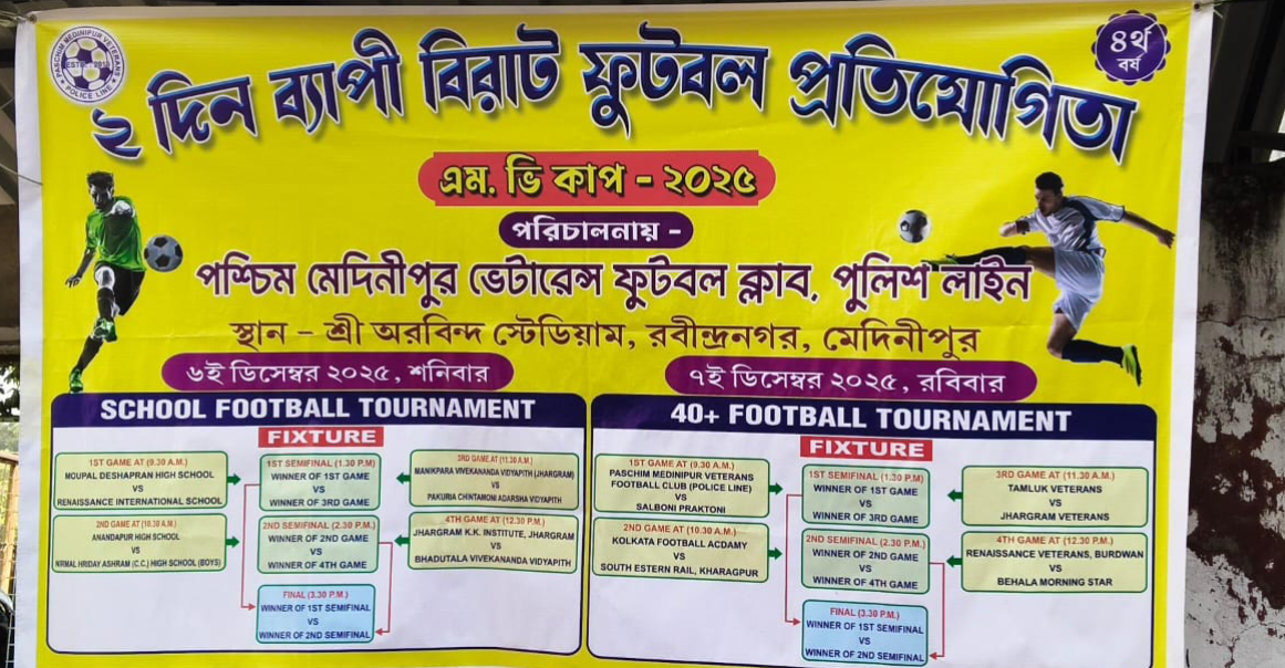 পশ্চিম মেদিনীপুর সেখ ওয়ারেশ আলী : পশ্চিম মেদিনীপুর ভেটারেন্স ফুটবল ক্লাবের উদ্যোগে রবিবার মেদিনীপুর অরবিন্দ স্টেডিয়ামের সবুজ মাঠ যেন পরিণত হয়েছিল এক উৎসবমুখর ফুটবল অঙ্গনে। শুরু হলো এমভি কাপ ২০২৫–এর দু’দিন ব্যাপী বর্ণাঢ্য ফুটবল প্রতিযোগিতা।