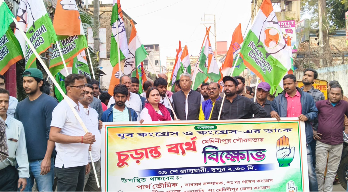 মিছিলটি মেদিনীপুর শহরের বিভিন্ন গুরুত্বপূর্ণ রাস্তা পরিক্রমা করে মেদিনীপুর পৌরসভার সামনে এসে পৌঁছায়। এরপর পৌরসভার গেটের সামনে দীর্ঘক্ষণ ধরে বিক্ষোভ দেখান কংগ্রেস ও যুব কংগ্রেসের নেতা-কর্মীরা। পৌরসভা কে একটি ডেকোরেশন জমা দেওয়া হয়। বিক্ষোভ কর্মসূচিতে উপস্থিত ছিলেন প্রদেশ কংগ্রেসের সাধারণ সম্পাদক পার্থ ভৌমিক, পশ্চিম মেদিনীপুর জেলা কংগ্রেস সভাপতি দেবাশীষ ঘোষ, প্রদেশ যুব কংগ্রেসের সাধারণ সম্পাদক কৌশিক বৈদ্য, অনিল শিকারি, মেদিনীপুর পৌরসভার কংগ্রেস কাউন্সিলার মহম্মদ সাইফুল সহ দলের অন্যান্য নেতৃত্ব ও কর্মী-সমর্থকরা।