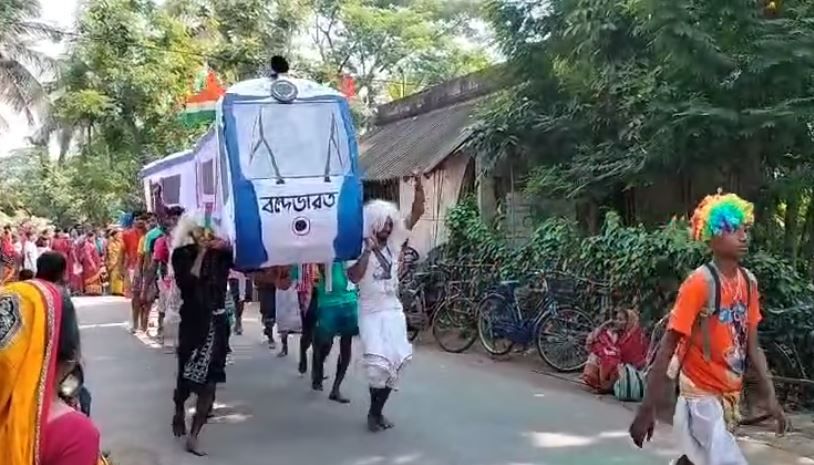 পূর্ব মেদিনীপুর নিজস্ব সংবাদদাতা : নীল ষষ্ঠী উপলক্ষে শিবের মাথায় জল ঢালার রেওয়াজ রয়েছে এ বাংলায়। সারাদিন উপোস থেকে শিব লিঙ্গের মাথায় ডাবজল, দুধ ও জল ঢালে পুণ্যার্থীরা।আর সেই শিবের মাথায় জল ঢালতেই বন্দে ভারত এক্সপ্রেসের মডেল কাঁধে নিয়ে শিব মন্দিরের দিকে এগিয়ে চলেছেন তমলুকের একদল ভক্ত । তমলুকের একদল ভক্ত সবং ব্লকের মোহাড় গ্রাম পঞ্চায়েতের অন্তর্গত বাসুলিয়া শিব মন্দিরে জল ঢালতে যান বন্দেভারত এক্সপ্রেসের মডেল কাঁধে নিয়ে । গন্তব্য পশ্চিম মেদিনীপুর জেলার সবং ব্লকের মোহাড় গ্রাম পঞ্চায়েতের অন্তর্গত বাসুলিয়া এলাকার শিব মন্দির । আর বন্দেভারত এক্সপ্রেসের মডেল কাঁধে নিয়ে জল ঢালতে যাওয়া দেখতে গ্রামের মানুষ রাস্তার দুদিকে ভিড় জমিয়ে ছিল । আসলে ভোলে বাবার শোভাযাত্রায় কিছু ভক্তরা কাঁধে বাকের আদলে একটি বন্দে ভারতের মডেল বানান। আর সেটিকেই ভোলে বাবার জয়গান করতে করতে নিয়ে যান।