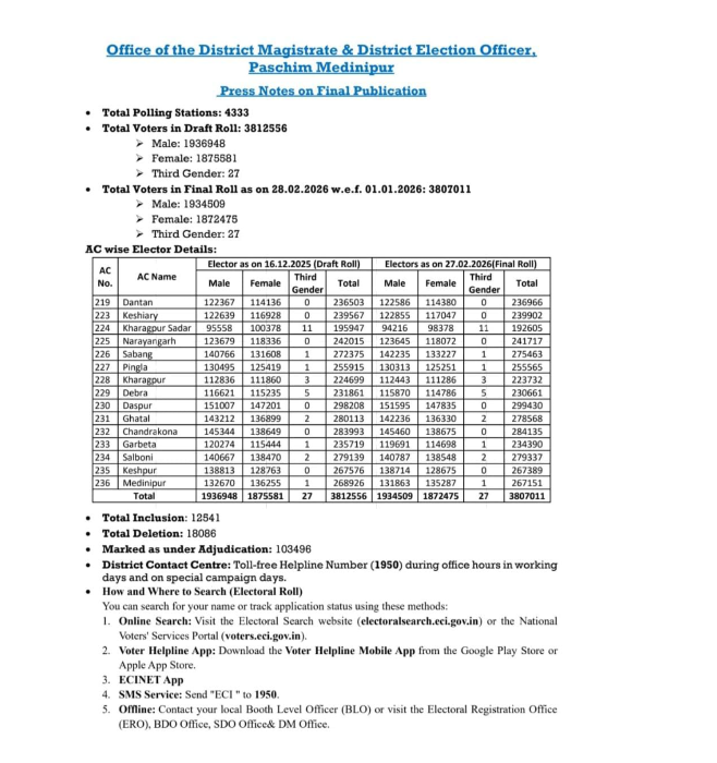 পশ্চিম মেদিনীপুর সেখ ওয়ারেশ আলী : ২৮শে ফেব্রুয়ারি, শনিবার দুপুরের পর প্রকাশ্যে এল এসআইআর ২০২৬-এর চূড়ান্ত পর্যায়ের ভোটার তালিকা। পশ্চিম মেদিনীপুর জেলাশাসক দপ্তরে এদিন প্রশাসনিক তৎপরতা ছিল চোখে পড়ার মতো। উপস্থিত ছিলেন বিভিন্ন দপ্তরের আধিকারিকরা, পাশাপাশি বিভিন্ন বুথের বিএলও-রাও। তালিকা প্রকাশের পরপরই বুথভিত্তিক ভোটার তালিকা সংশ্লিষ্ট বুথে টাঙানোর কাজ শুরু করেন বিএলওরা।