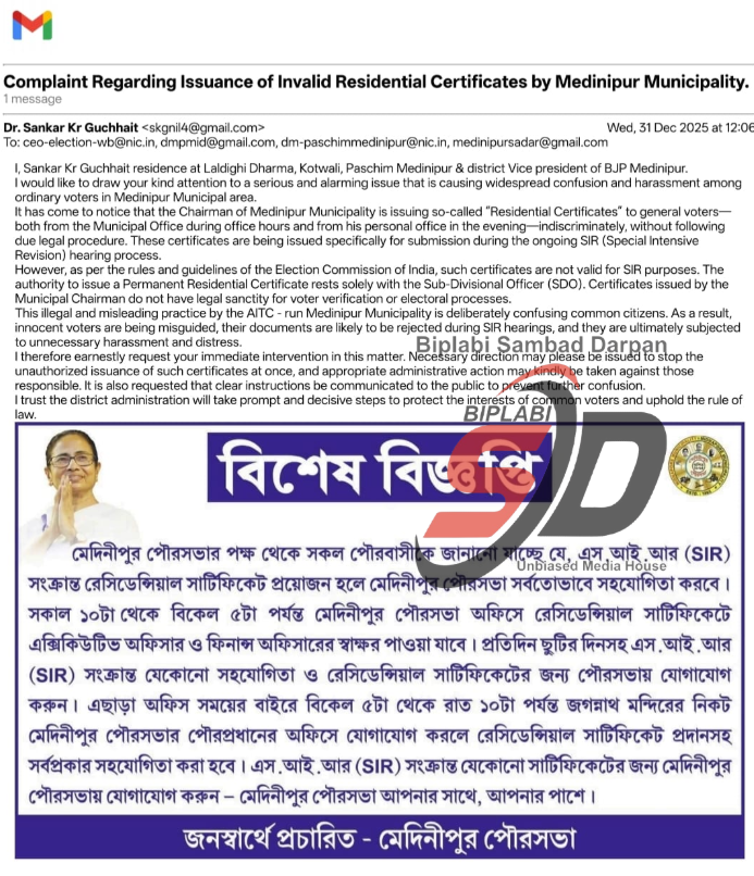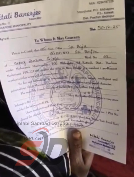 পশ্চিম মেদিনীপুর সেখ ওয়ারেশ আলী : পশ্চিম মেদিনীপুরে স্পেশাল ইনটেনসিভ রিভিশন (এস আই আর) পর্বে যখন ভোটার তালিকা সংক্রান্ত শুনানি চলছে, ঠিক সেই সময়েই মেদিনীপুর পৌরসভার একটি বিজ্ঞপ্তিকে কেন্দ্র করে তৈরি হয়েছে চরম বিতর্ক। পৌরসভার তরফে প্রকাশিত ওই বিজ্ঞপ্তিতে জানানো হয়েছে, এস আই আর শুনানির জন্য প্রয়োজন পড়লে রেসিডেন্সিয়াল সার্টিফিকেট মিলবে মেদিনীপুর পৌরসভা থেকে। এমনকি অফিস টাইমের বাইরেও বিকেল পাঁচটা থেকে রাত দশটা পর্যন্ত পৌরপ্রধানের ব্যক্তিগত অফিস থেকেও এই সার্টিফিকেট দেওয়া হবে বলে বিজ্ঞপ্তিতে উল্লেখ করা হয়েছে।এই বিজ্ঞপ্তি প্রকাশের পর থেকেই বিষয়টি নিয়ে রাজনৈতিক মহল থেকে শুরু করে প্রশাসনিক স্তর পর্যন্ত জোর চর্চা শুরু হয়েছে। বিজ্ঞপ্তির জেরে রেসিডেন্সিয়াল সার্টিফিকেট সংগ্রহ করতে ভিড় জমছে মেদিনীপুর পৌরসভায়।