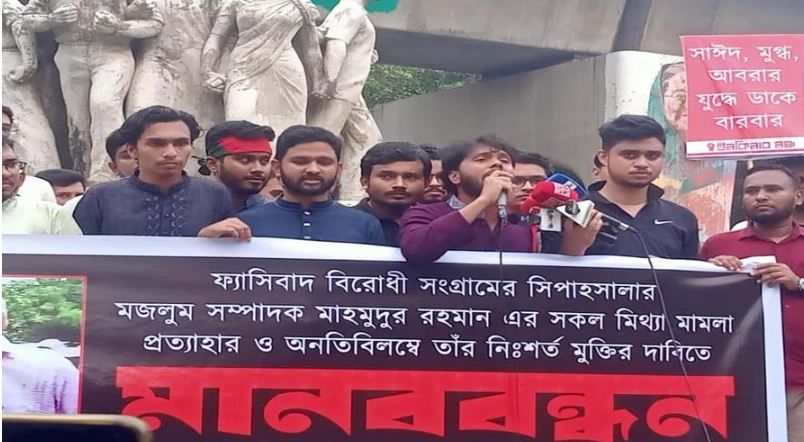 ঢাকা, জাকির হোসেন: বাংলাদেশের ক্ষমতাচ্যুত প্রধানমন্ত্রী শেখ হাসিনার আমলে তার সরকারের নির্দেশে বন্ধ হয়ে যাওয়া তুমুল পাঠকপ্রিয় ও প্রভাবশালী দৈনিক পত্রিকা আমার দেশ এর সম্পাদক মাহমুদুর রহমানের বিরুদ্ধে হাসিনার আমলে করা সব মিথ্যা মামলা প্রত্যাহার ও অনতিবিলম্বে তাঁর নিঃশর্ত মুক্তির দাবিতে ৪৮ ঘণ্টার আলটিমেটাম দিয়েছে বাংলাদেশের সাধারণ শিক্ষার্থীদের সংগঠন ইনকিলাব মঞ্চ। মঙ্গলবার (১ অক্টোবর) ঢাকা বিশ্ববিদ্যালয়ের রাজু ভাস্কর্যের পাদদেশে মানববন্ধন করে সংগঠনটি। মানববন্ধন থেকে ৪৮ ঘণ্টার এই আলটিমেটাম দেওয়া হয়। এই সময়ের মধ্যে বাংলাদেশের অন্তর্বর্তী সরকারের আইন উপদেষ্টা ড. আসিফ নজরুল নিজে উদ্যোগ নিয়ে মাহমুদুর রহমানের মুক্তির ব্যবস্থা না করলে তাঁর কার্যালয়ের সামনে বিক্ষোভ ও দেশজুড়ে লাগাতার আন্দোলন কর্মসূচির ঘোষণা দিয়েছে সংগঠনটি। সেসময় আন্দোলনকারীদের, ‘সাহসের অপর নাম, মাহমুদুর রহমান’, ‘মাহমুদ ভাইয়ের কিছু হলে, জ্বলবে আগুন ঘরে ঘরে’, ‘জেলের তালা ভাঙবো, মাহমুদ ভাইকে আনবো’, 'মাহমুদ ভাই ভয় নাই, রাজপথ ছাড়ি নাই' সহ বিভিন্ন স্লোগান দিতে দেখা যায়৷ মানববন্ধনে ইনকিলাব মঞ্চের সঙ্গে সংহতি জানিয়ে বক্তব্য রাখেন বিভিন্ন পেশাজীবী সংগঠনের নেতারা। জাতীয় প্রেসক্লাবের প্রাক্তন সাধারণ সম্পাদক ও আমার দেশ পত্রিকার নির্বাহী সম্পাদক সৈয়দ আবদাল আহমেদ বলেন, 'আজ সারাদেশের মানুষের মধ্যে শেখ হাসিনার ফ্যাসিবাদের বিরুদ্ধে যে ঘৃণা সৃষ্টি হয়েছে, সেই ঘৃণার জন্ম দিয়েছেন মাহমুদুর রহমান। আমার দেশ পত্রিকায় একবার আমরা আদালতের বিষয় নিয়ে একটি অনুসন্ধানী প্রতিবেদন করেছিলাম। সেজন্য আদালতের মুখোমুখি হতে হয়েছিল। সেসময় ব্যারিস্টার রফিকুল ইসলাম সহ জ্যেষ্ঠ আইনজীবীরা তাঁকে (মাহমুদুর রহমানকে) ক্ষমা চাইতে বলেছিলেন। কিন্তু তিনি বলেছিলেন, আমরা কোনো অসত্য রিপোর্ট করিনি। সুতরাং ক্ষমা চাওয়ার প্রশ্নই আসে না। তিনিই সবার প্রথমে শেখ হাসিনাকে ফ্যাসিবাদী বলতে সাহস করেছিলেন, আর আজ তাঁকেই কারাগারে পাঠানো হয়েছে।' আমার দেশ পত্রিকার বার্তা সম্পাদক জাহেদ চৌধুরী বলেন, 'মাহমুদুর রহমান সবসময় সত্য ও ন্যায়ের পক্ষে আধিপত্যবাদীদের বিরুদ্ধে শক্তিশালী ভূমিকা রেখেছেন৷ স্বাধীনতা ও সার্বভৌমত্বের পক্ষে সাহস জুগিয়ে এসেছেন। আইন মান্যকারী ব্যক্তি হিসেবে আদালতে আত্মসমর্পণ করেছিলেন। কিন্তু তাঁকে জামিন না দিয়ে কারাগারে পাঠিয়ে দেওয়া হয়েছে। আমরা দেখেছি, অনেকেই কারাগারে না গিয়েও জামিন পেয়ে বাড়িতে বসে জীবন উপভোগ করছেন৷ কিন্তু মাহমুদুর রহমানের ক্ষেত্রে এর ব্যত্যয় ঘটেছে। এর আইনগত ব্যাখ্যা যা-ই থাকুক না কেনো, শেখ হাসিনা সরকারের যে আইন, স্বৈরাচারী সরকারের যে রায়- গণঅভ্