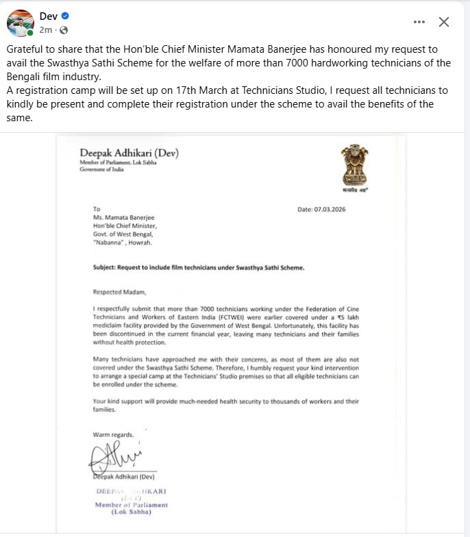 এই পরিস্থিতিতে সাংসদ-অভিনেতা দেব সরাসরি মুখ্যমন্ত্রী মমতা বন্দ্যোপাধ্যায়ের কাছে বিষয়টি উত্থাপন করেন। টেকনিশিয়ানদের সামাজিক ও শারীরিক নিরাপত্তার কথা বিবেচনা করে মুখ্যমন্ত্রী সেই প্রস্তাবে সম্মতি জানান।নিজের সোশ্যাল মিডিয়া হ্যান্ডেলে সুখবরটি জানিয়ে দেব লিখেছেন, “মুখ্যমন্ত্রী মমতা বন্দ্যোপাধ্যায় আমার অনুরোধে সাড়া দিয়ে বাংলা সিনেমার ৭ হাজারেরও বেশি পরিশ্রমী টেকনিশিয়ানের কল্যাণে ‘স্বাস্থ্যসাথী’ প্রকল্পের সুবিধা দেওয়ার সিদ্ধান্ত নিয়েছেন। এজন্য আমি তাঁর কাছে আন্তরিকভাবে কৃতজ্ঞ।”এই সিদ্ধান্তে টলিউডের কর্মীদের মধ্যে স্বস্তি ও আনন্দের পরিবেশ তৈরি হয়েছে বলে জানা গেছে। বহুদিনের দাবি পূরণ হওয়ায় স্টুডিওপাড়ায় ইতিমধ্যেই শুরু হয়েছে আশাবাদের নতুন আলো।