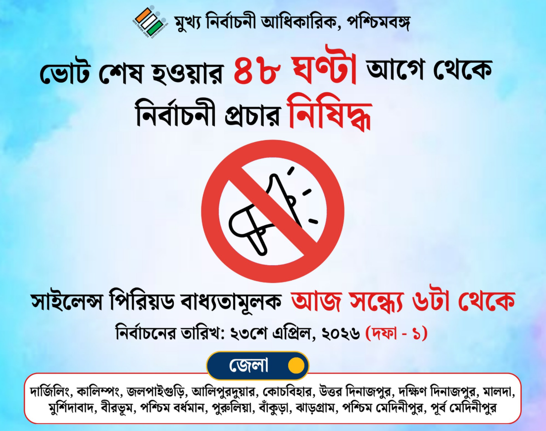 নিজস্ব সংবাদদাতা : ভোটের আগে কড়া নিয়ম জারি করল Election Commission of India। কমিশন জানিয়েছে, নির্ধারিত সময় থেকে শুরু হচ্ছে ৪৮ ঘণ্টার ‘নীরবতা বিধি’ (Silence Period), যা ভোটগ্রহণ শেষ না হওয়া পর্যন্ত বহাল থাকবে।নির্দেশ অনুযায়ী, দার্জিলিং, কালিম্পং, জলপাইগুড়ি, আলিপুরদুয়ার, কোচবিহার, উত্তর দিনাজপুর, দক্ষিণ দিনাজপুর, মালদা, মুর্শিদাবাদ, বীরভূম-সহ একাধিক জেলার বিধানসভা কেন্দ্রগুলিতে মঙ্গলবার ২১ এপ্রিল, ২০২৬ সন্ধ্যা ৬টা থেকে এই নীরবতা শুরু হচ্ছে।
