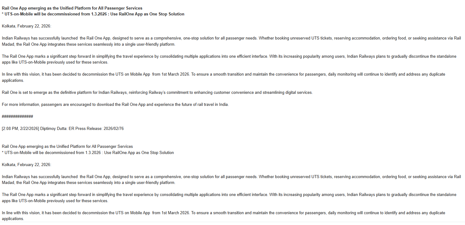 রূপান্তর প্রক্রিয়া যাতে নির্বিঘ্ন হয়, সে জন্য নিয়মিত নজরদারি চালানো হবে এবং কোনও ডুপ্লিকেট বা বিভ্রান্তিকর অ্যাপ সক্রিয় থাকলে তা চিহ্নিত করা হবে।রেলের ডিজিটাল পরিষেবাকে আরও সুশৃঙ্খল, সহজ ও গ্রাহকবান্ধব করে তুলতেই এই পদক্ষেপ বলে জানানো হয়েছে। যাত্রীদের ইতিমধ্যেই ‘রেল ওয়ান’ অ্যাপ ডাউনলোড করে নতুন পরিষেবার সঙ্গে পরিচিত হওয়ার আহ্বান জানানো হয়েছে।স্পষ্ট বার্তা—এবার থেকে রেলের সব কাজ এক অ্যাপেই। ১ মার্চের পর ‘ইউটিএস অন মোবাইল’-এর দিন শেষ।