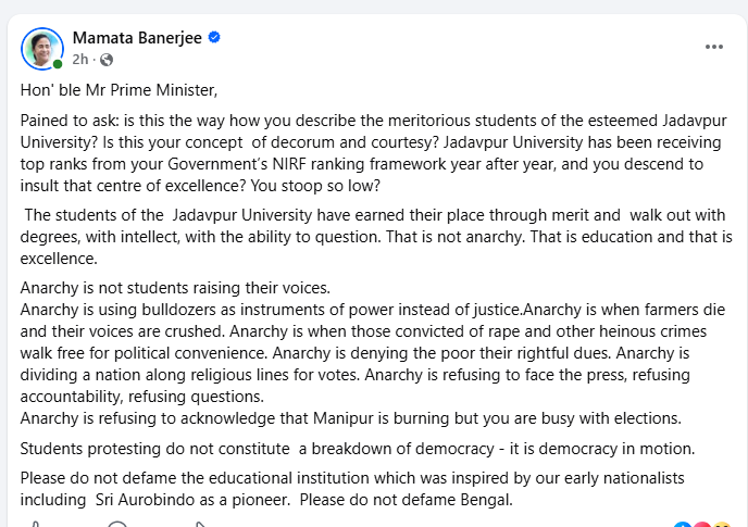 কেন্দ্রীয় সরকারের ‘NIRF’ র্যাঙ্কিংয়েও যাদবপুর বরাবর শীর্ষস্থানে থেকেছে—তবুও সেই প্রতিষ্ঠানের সম্মান ক্ষুণ্ণ করার চেষ্টা করা হচ্ছে বলে অভিযোগ তাঁর।তিনি স্পষ্ট করে জানান, যাদবপুরের শিক্ষার্থীরা নিজেদের মেধা, যুক্তিবোধ এবং প্রশ্ন করার ক্ষমতার জন্যই পরিচিত। প্রতিবাদ করা তাদের অধিকার—একে কোনওভাবেই নৈরাজ্য বলা যায় না। বরং এটাই গণতন্ত্রের প্রাণ, যেখানে প্রশ্ন তোলা এবং মত প্রকাশের স্বাধীনতা থাকে।এর পাশাপাশি তিনি ‘নৈরাজ্য’-এর সংজ্ঞা টেনে কেন্দ্রকে কড়া ভাষায় আক্রমণ করেন। তাঁর মতে, নৈরাজ্য হল যখন প্রশাসনিক ক্ষমতা দেখাতে বুলডোজার ব্যবহার করা হয়, যখন কৃষকদের কণ্ঠস্বর দমন করা হয়, যখন অপরাধীরা রাজনৈতিক স্বার্থে রক্ষা পায়, অথবা যখন ধর্মের ভিত্তিতে সমাজকে বিভক্ত করা হয়।মণিপুরের পরিস্থিতির প্রসঙ্গ টেনেও তিনি প্রশ্ন তোলেন—রাজ্য যখন অশান্ত, তখন কেন্দ্রীয় নেতৃত্ব নির্বাচনী প্রচারে ব্যস্ত কেন?মুখ্যমন্ত্রী আরও বলেন, শিক্ষার্থীদের প্রতিবাদ গণতন্ত্রের দুর্বলতা নয়, বরং তার শক্তি। তাই ঐতিহ্যবাহী এই শিক্ষা প্রতিষ্ঠানকে কলঙ্কিত না করার আবেদন জানান তিনি। একইসঙ্গে বাংলার সম্মান রক্ষার বার্তাও স্পষ্টভাবে তুলে ধরেন।রাজনৈতিক মহলে এই মন্তব্য ঘিরে ইতিমধ্যেই শুরু হয়েছে তীব্র বিতর্ক।