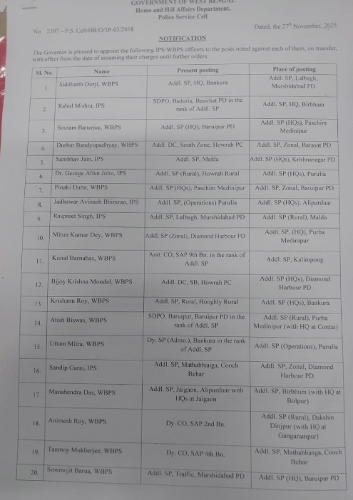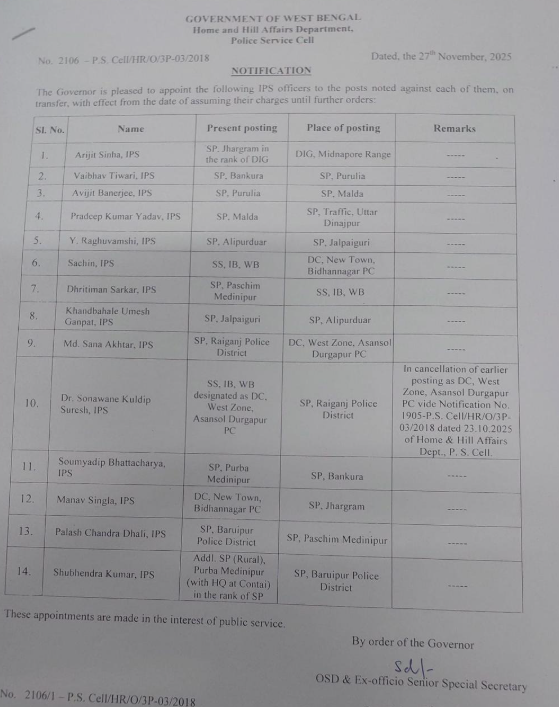 • মালদার SP প্রদীপকুমার যাদব—নতুন দায়িত্ব উত্তর দিনাজপুর SP (ট্র্যাফিক)।