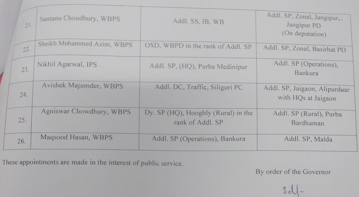 • মহম্মদ সানা আখতার—নতুন দায়িত্ব আসানসোল–দুর্গাপুর কমিশনারেটের ওয়েস্ট জোন DC।