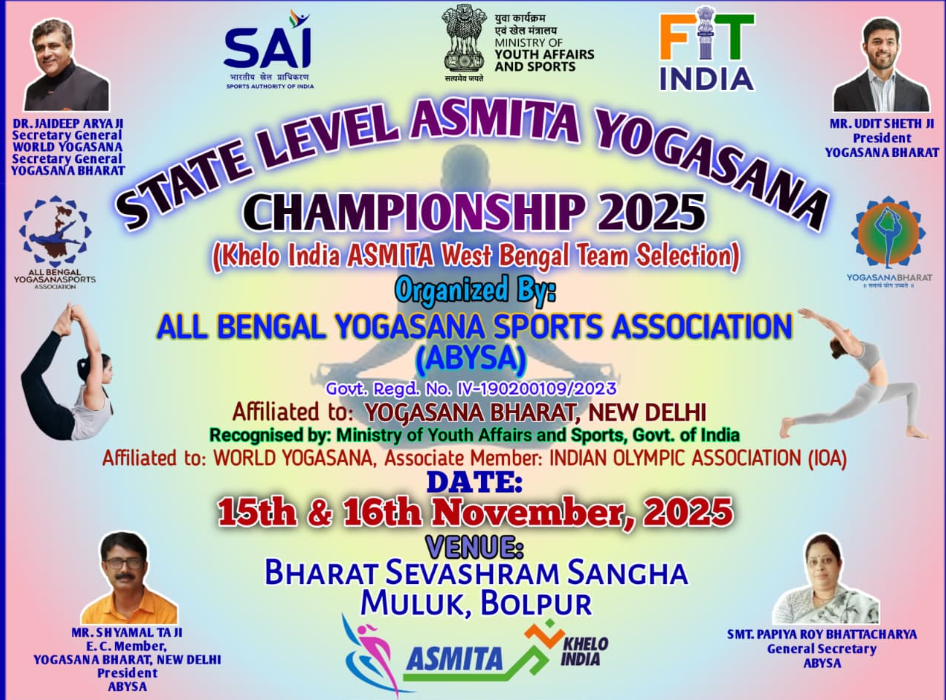 নিজস্ব সংবাদদাতা : সারা বাংলা যোগাসন স্পোর্টস এসোসিয়েশন উদ্যোগে বীরভূম জেলার বোলপুরের মুলুকে অবস্থিত ভারত সেবাশ্রম সংঘে শনিবার ও রবিবার এই দুদিন ধরে অনুষ্ঠিত হচ্ছে রাজ্য স্তরের অস্মিতা যোগাসন চ্যাম্পিয়নশিপ -২০২৫। মূল লক্ষ্য খেলো ইন্ডিয়া'র অন্তর্গত জাতীয় সৃতরের 'আস্মিতা' প্রতিযোগিতার জন্য রাজ্য দল নির্বাচন।বয়স ভিত্তিক তিনটি গ্রুপে গোটা রাজ্যের ১৮ থেকে ৫৫ বছর বয়সের প্রায় ১০০ নির্বাচিত হওয়া মহিলা প্রতিযোগী এই প্রতিযোগিতা যোগ দিচ্ছেন। এর আগে উত্তরবঙ্গ ও দক্ষিণবঙ্গের জেলা গুলি নিয়ে রাজ্যস্তরের আলাদা আলাদা লীগ এবং সমস্ত জেলার সমন্বয়ে কম্বাইন্ড লীগ অনুষ্ঠিত হয়। সেখান থেকেই এই প্রতিযোগীরা নির্বাচিত হয়ে এসেছেন।