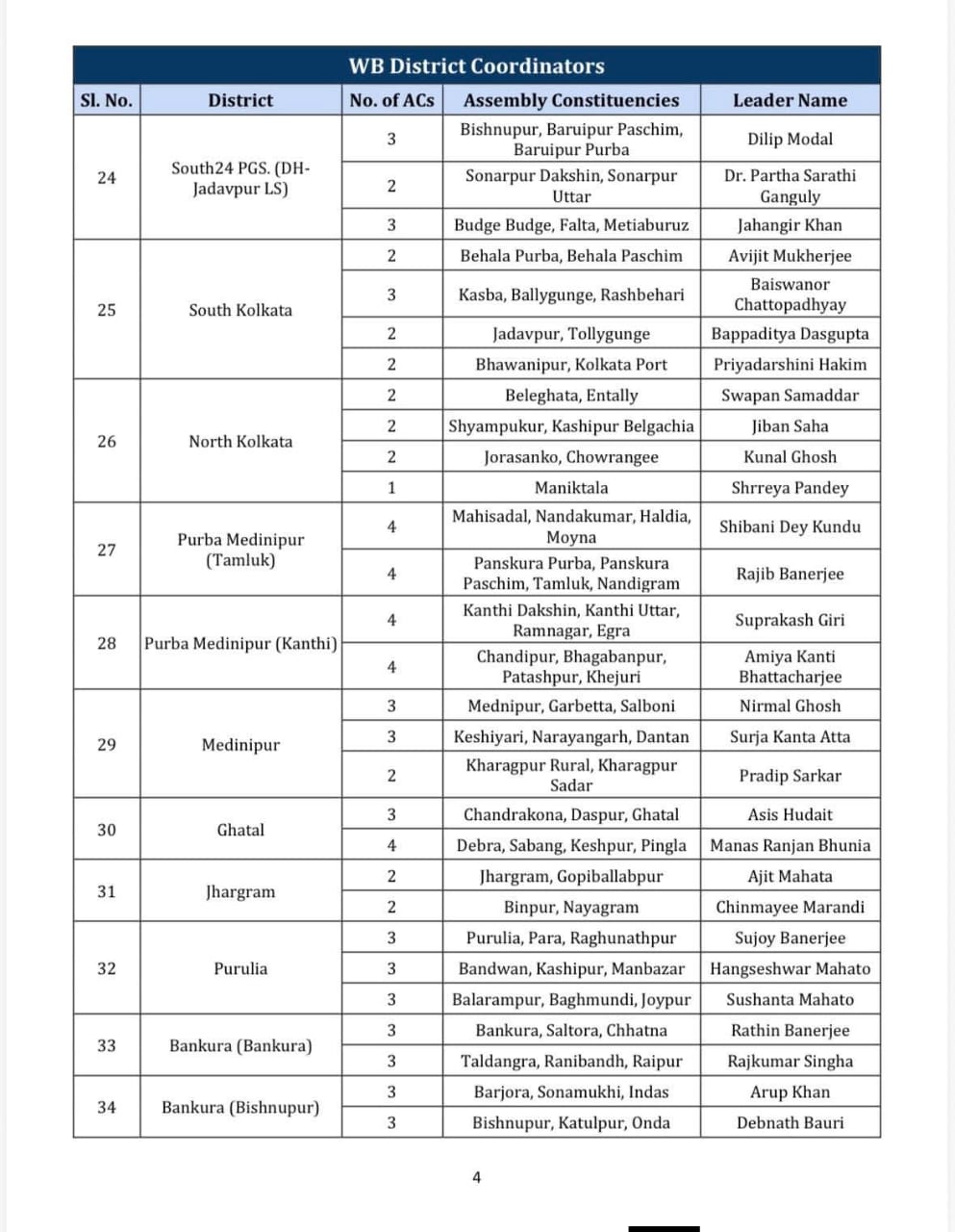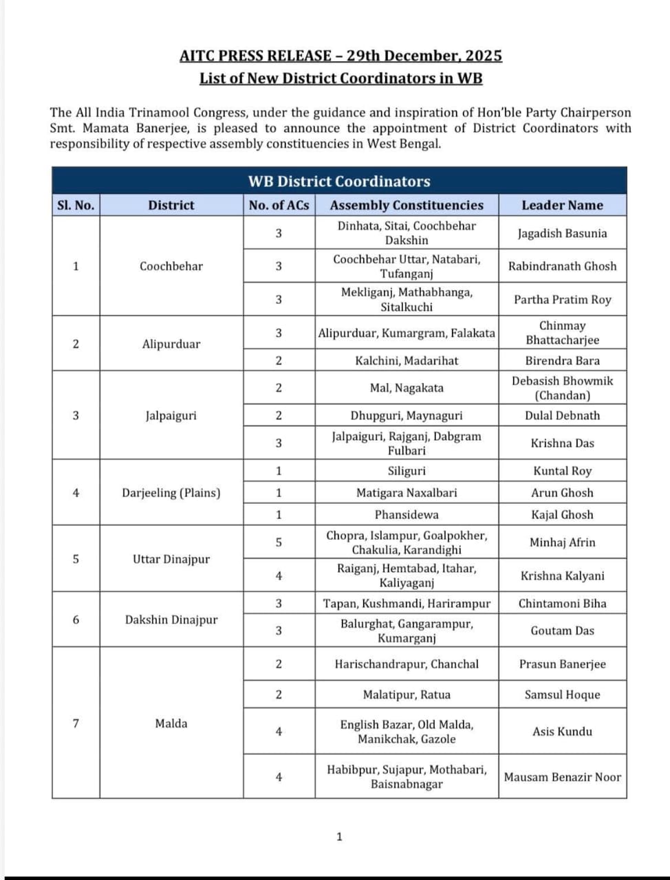 সুমন পাত্র, পশ্চিম মেদিনীপুর :- তৃণমূল কংগ্রেসের রাজ্য স্তর থেকে প্রকাশিত হল তৃণমূল কংগ্রেসের জেলা কো অর্ডিনেটর বা জেলা সমন্বয়কারীদের তালিকা।