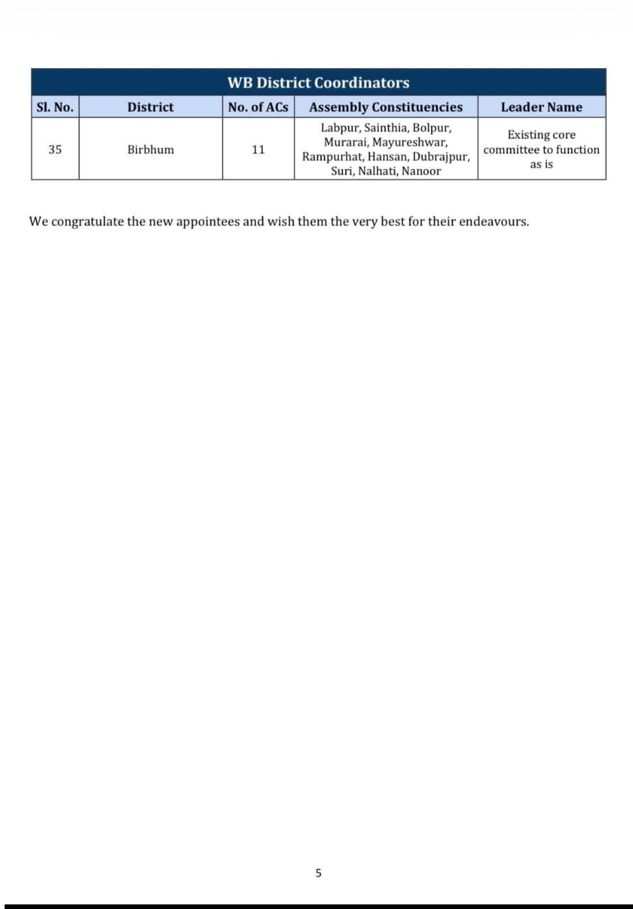 ঘাটাল সাংগঠনিক জেলায় ডেবরা পিংলা সবং ও কেশপুরের জন্য মানস ভুঁইয়া ও চন্দ্রকোনা ঘাটাল দাসপুরে আশিষ হুদাইতকে দায়িত্ব দেওয়া হয়েছে।